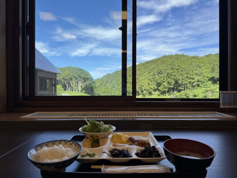 翌日の朝食は、標高900m超から望む青空とブナとともに。