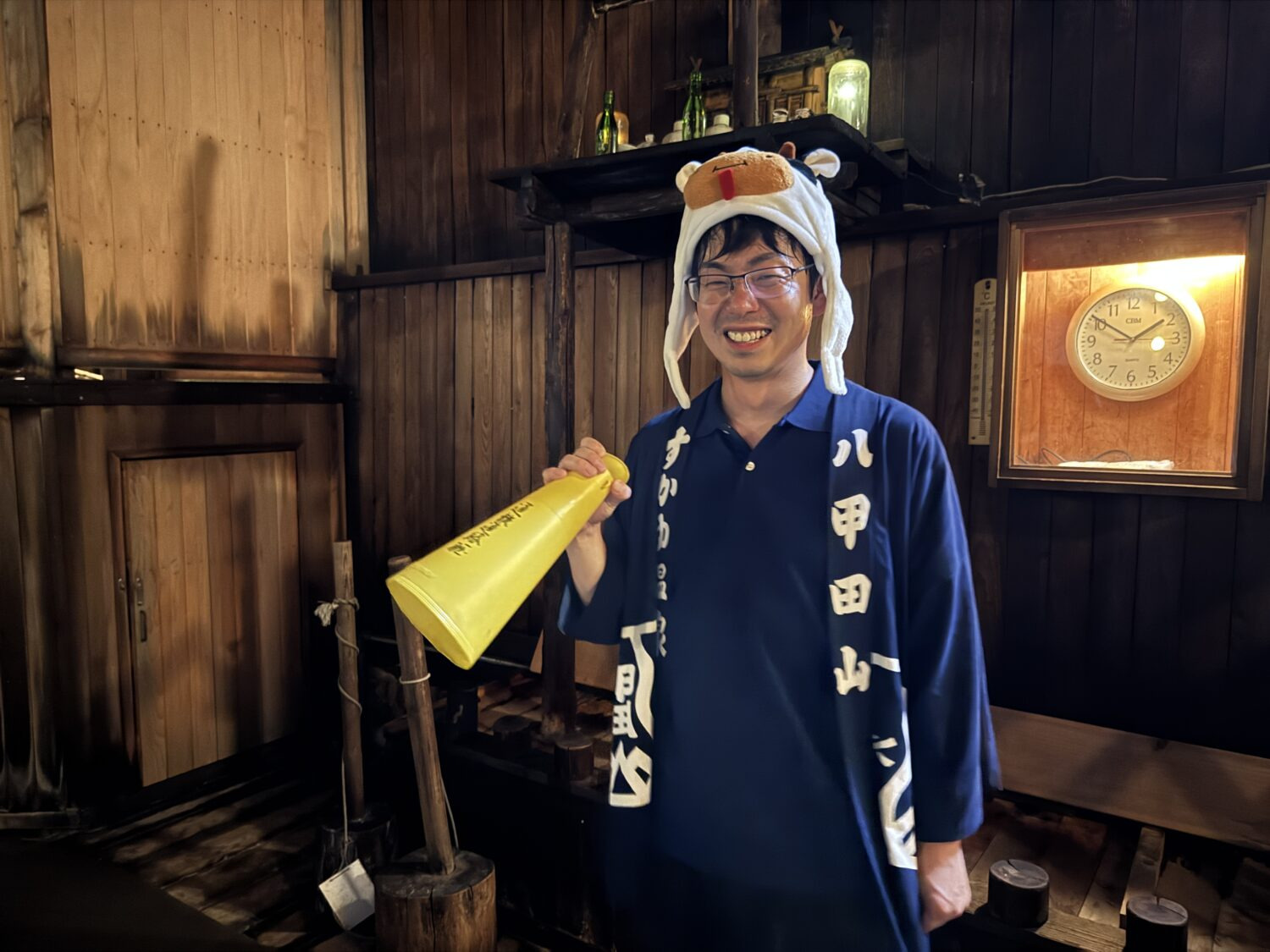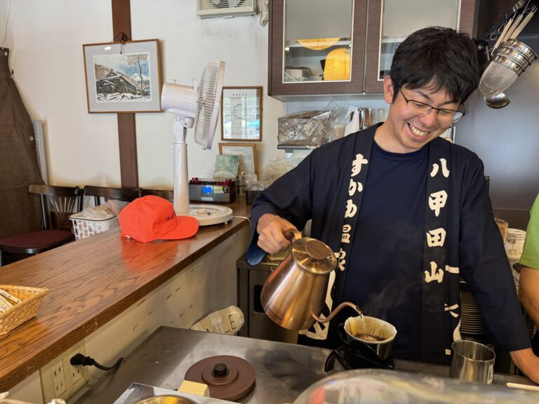 コーヒーを淹れてくれたのは、酸ヶ湯温泉株式会社 営業企画室の高田新太郎さん。酸ヶ湯温泉を盛り上げようと、年間を通じて様々なイベント企画や情報発信を精力的に行う、いわば「酸ヶ湯温泉の仕掛け人」です。酸ヶ湯温泉にとって特に重要なイベントである丑湯祭りの期間中は、ほぼ寝ずにイベント運営に携わっていたとのこと。