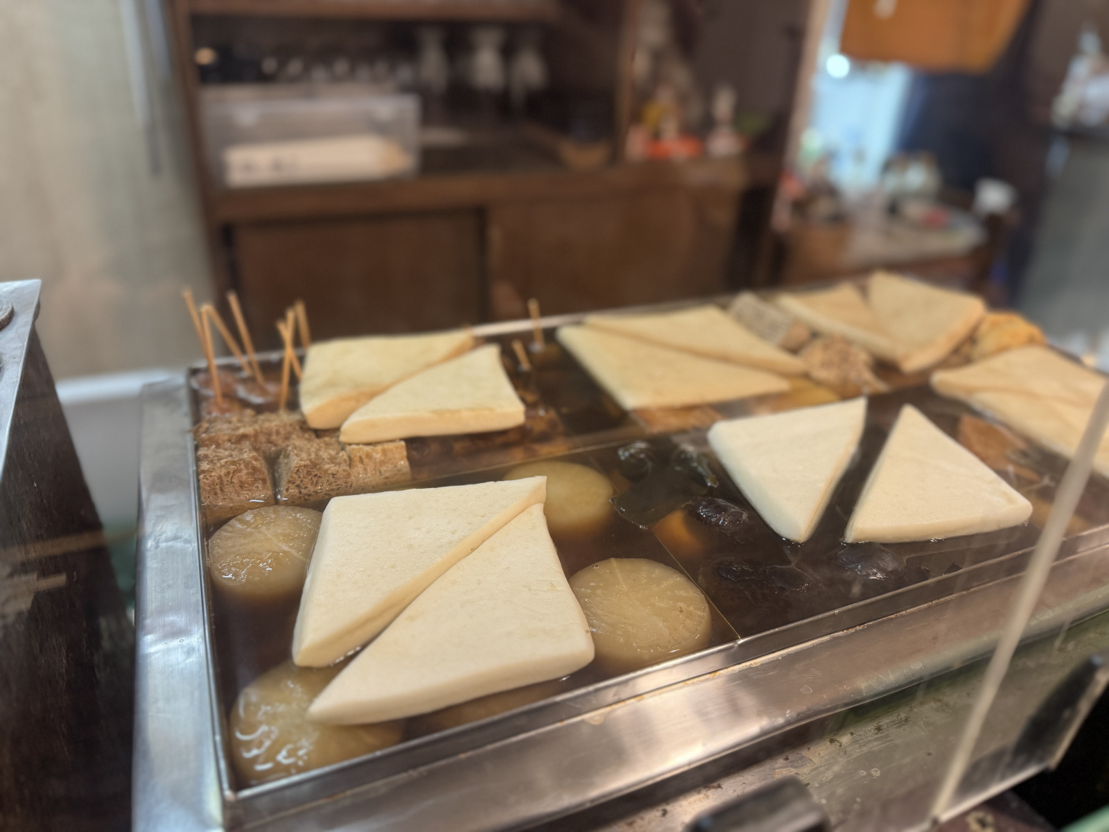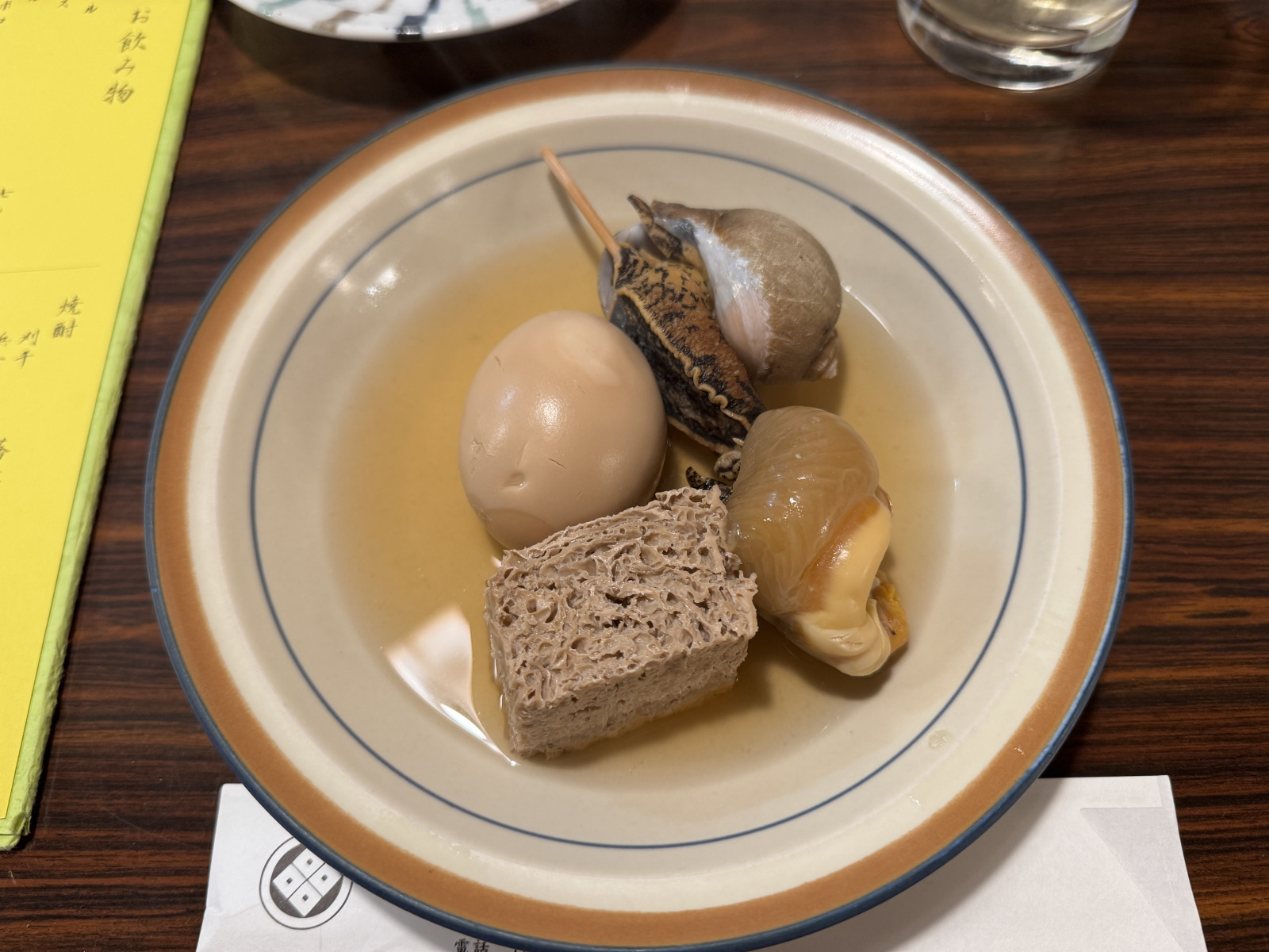 予約していたカウンター席からおでん鍋を覗きながら、時折メニューを見やる。「たつ」は白子のこと。「ゆでらっか」は茹で落花生で、「赤玉スライス」は紫玉ねぎ。
