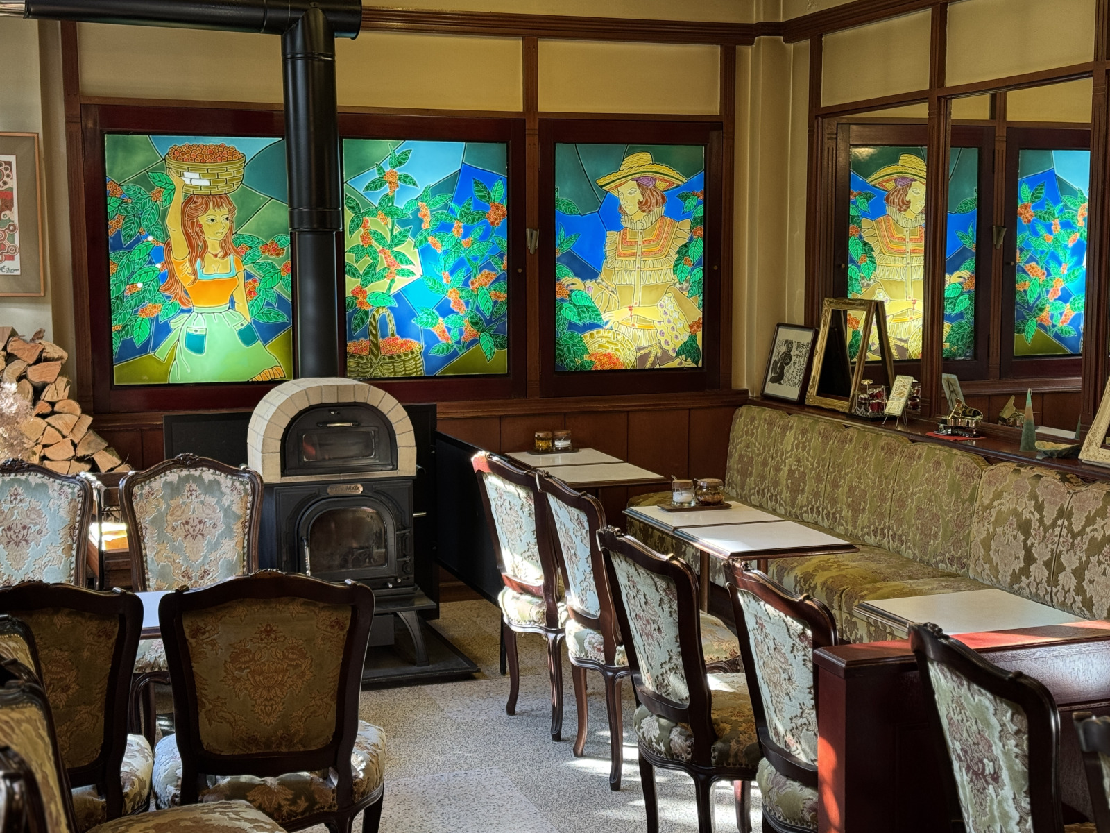 喫茶店というけれど、外観、内装とも豪華絢爛だ。店内にはクラシックのピアノ曲が流れ、店の奥には薪ストーブが置かれている。ストーブの横と窓の外に薪が積まれているから、寒い日にはこのストーブが客の体と心を温めてくれることだろう。