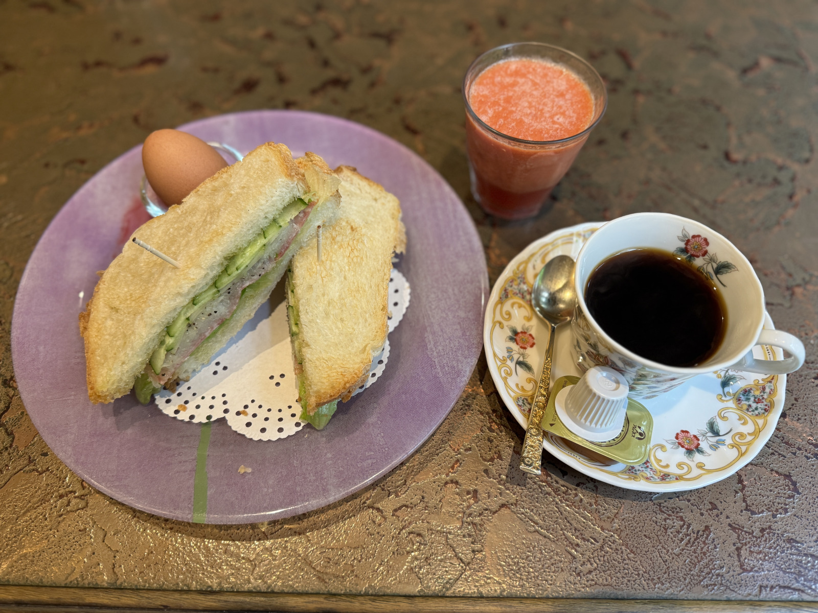 「サラサラサンド」というのを頼んだ。トマトとグレープフルーツのジュースにゆで卵、サラミ・セロリ・レタス・キュウリを挟んだサンドイッチ、それにコーヒーで1000円也。優雅な朝食になった。