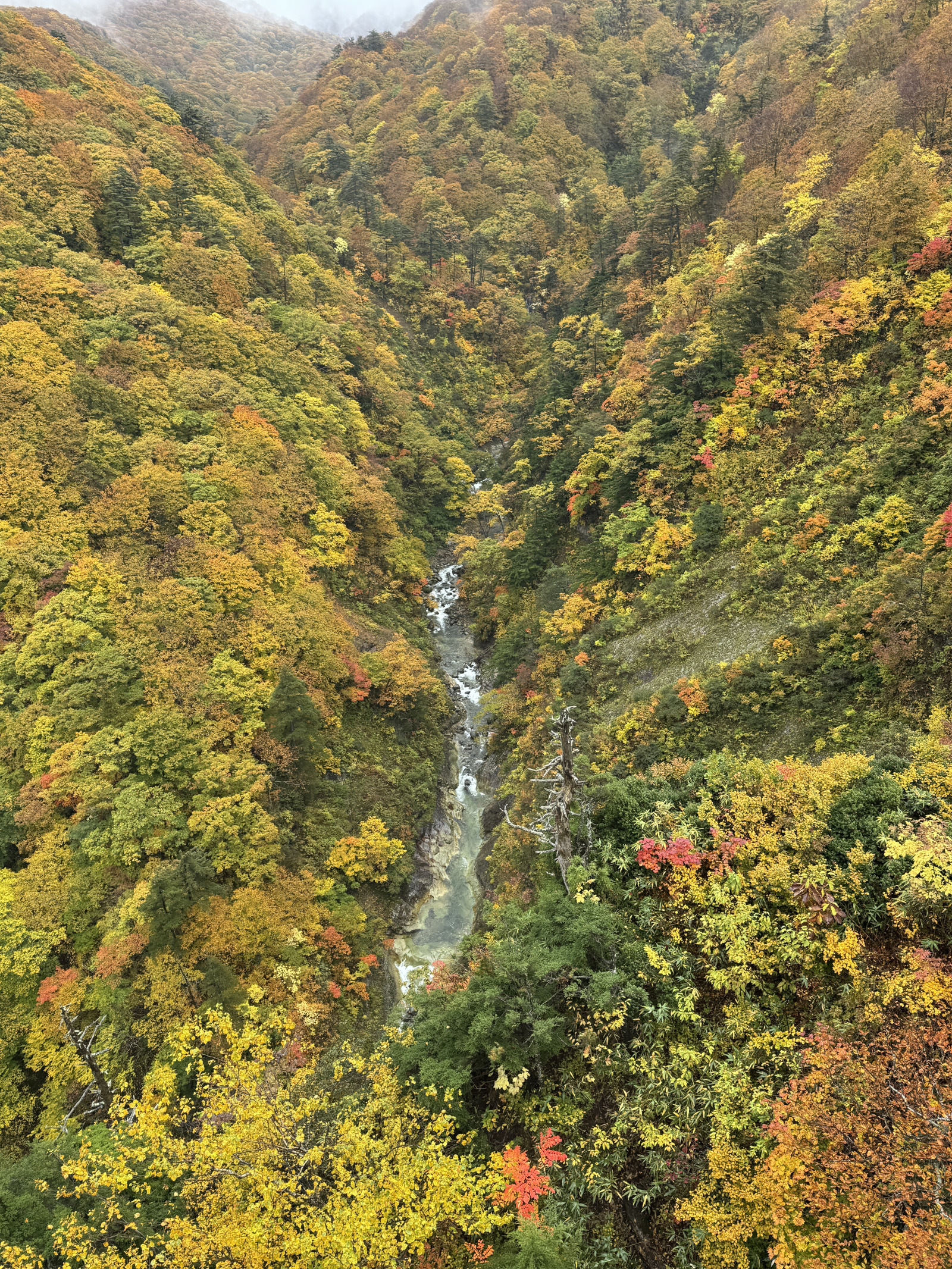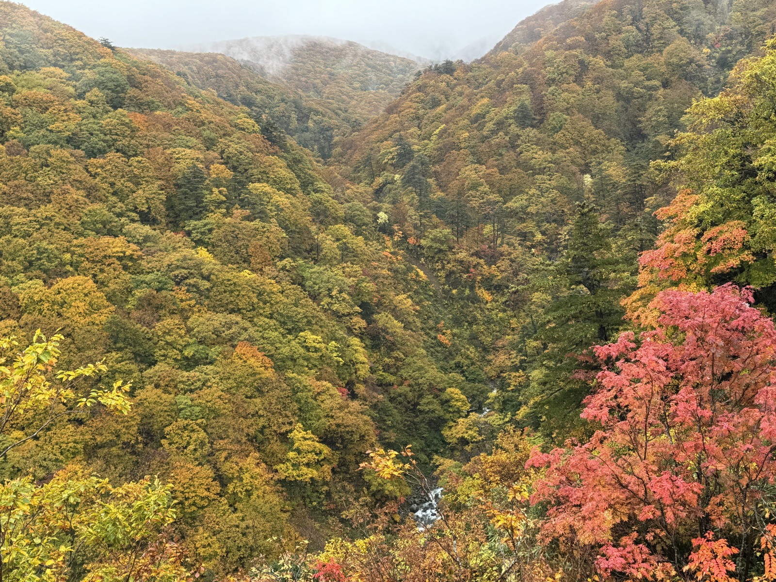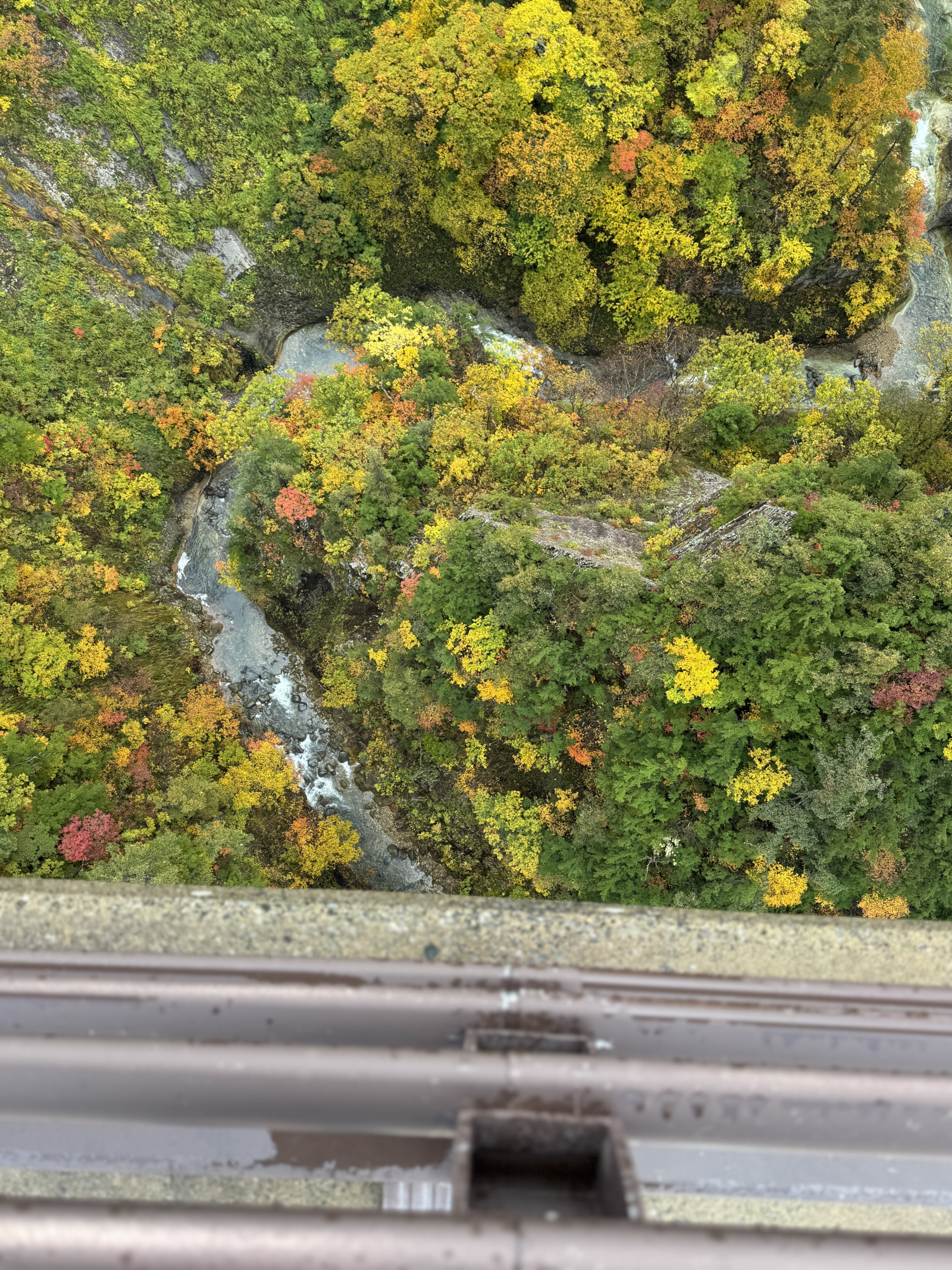 「山粧う(やまよそおう)」という秋の季語はこのことか。眼下を流れる城ヶ倉渓流を底にして、V字型にそびえる山々の全身が赤、黄色、緑のパッチワークになっている。空は雲に覆われているけれど、灰色の背景がむしろ好ましい。橋の長さは360メートル。橋の真ん中辺りから見下ろすと、渓流は122メートル下にある。