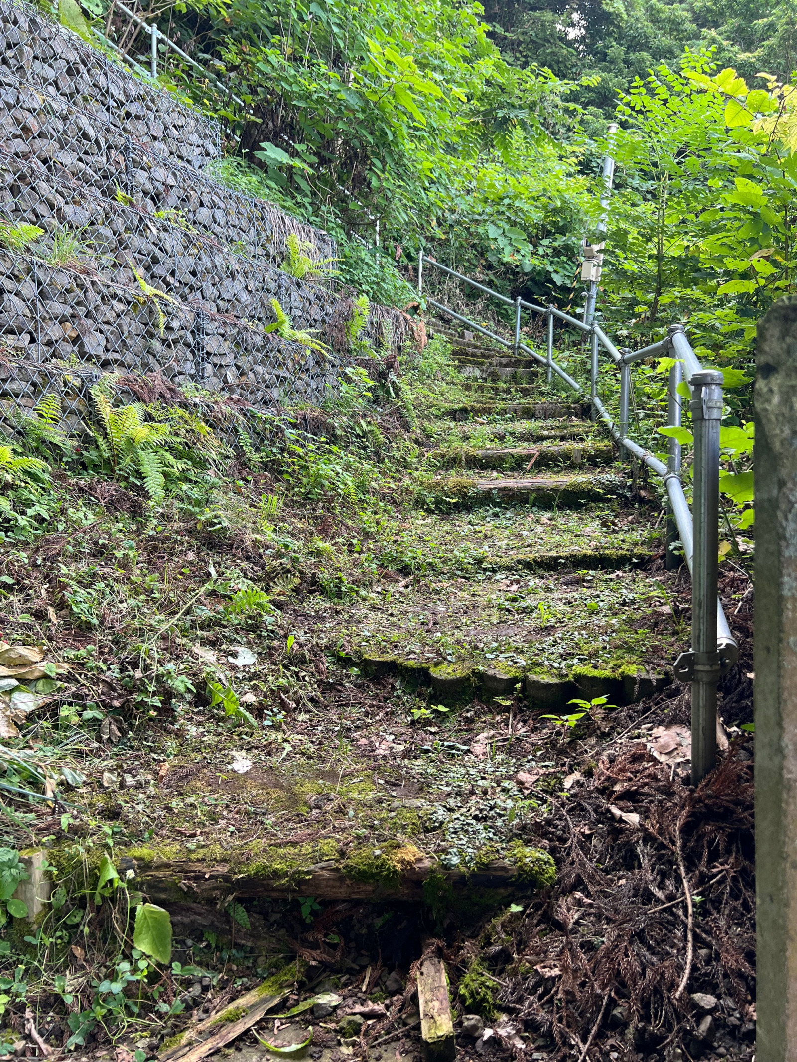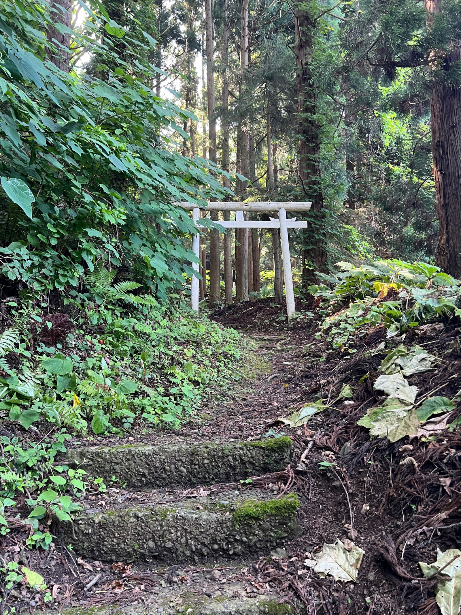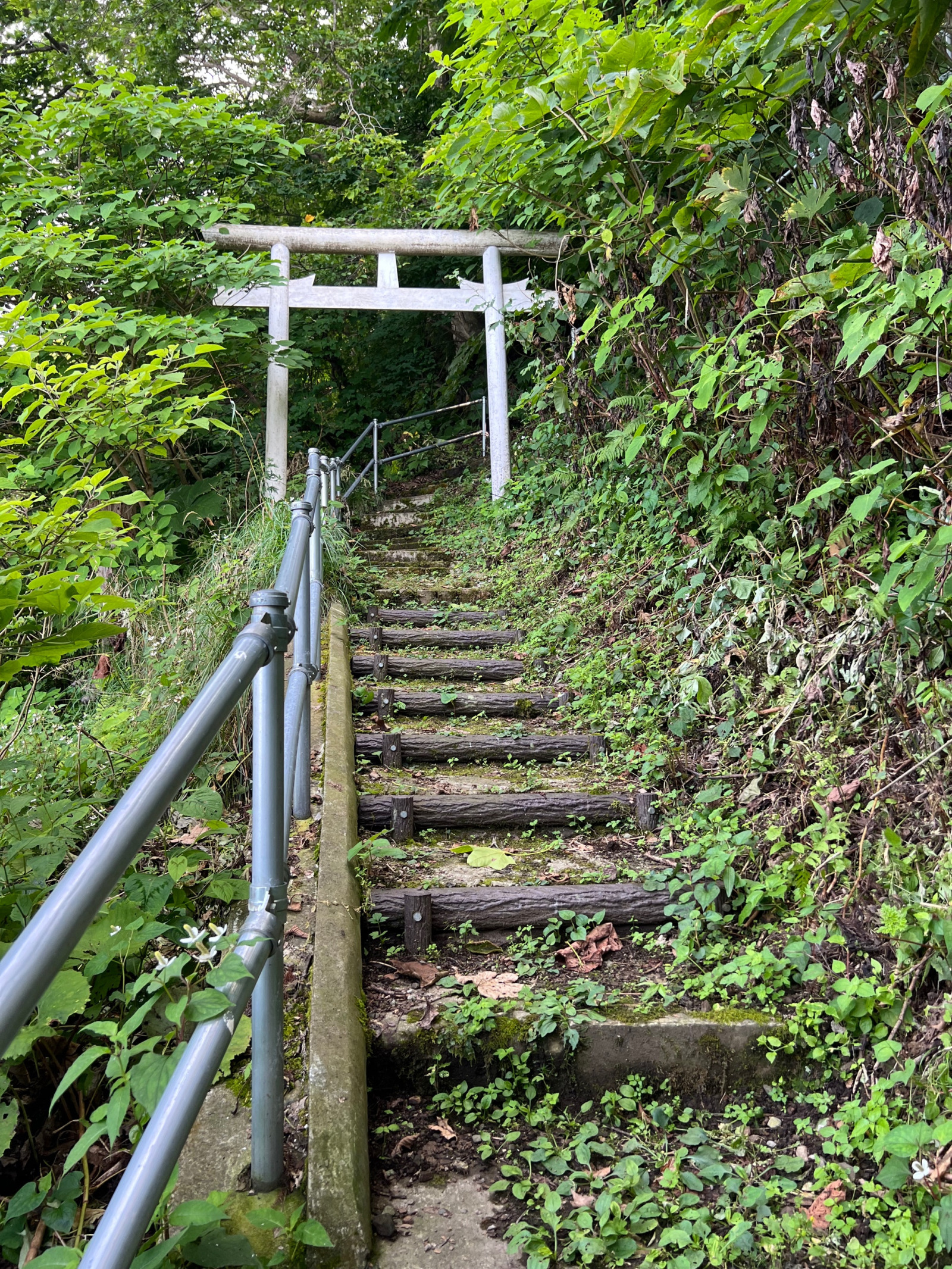 海のそばがすぐ山なので、当然、鳥居をくぐると長い階段がある。中年という自覚もしっかりしみついた私は階段の存在にかなりおじけづくが(階段は中年の敵である)、今回のお供となる若い2人の前で引き返すわけにはいかない。のぼりますよ。