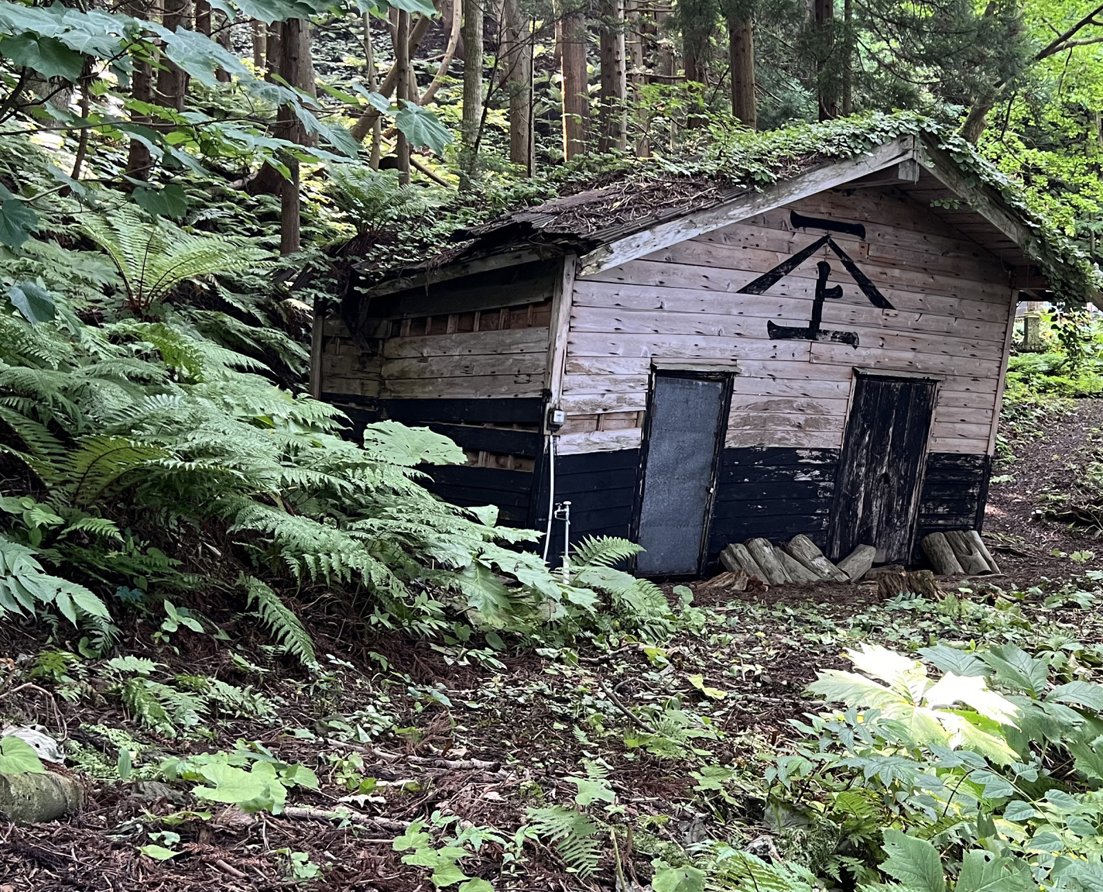 いよいよ森の中という雰囲気になってきて、傾いた小屋が現れた。