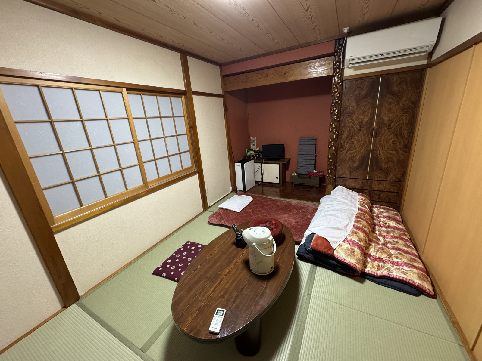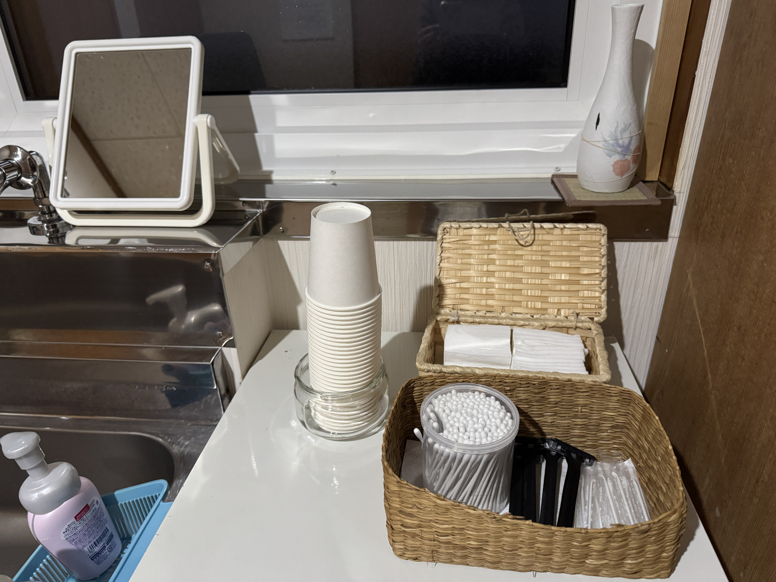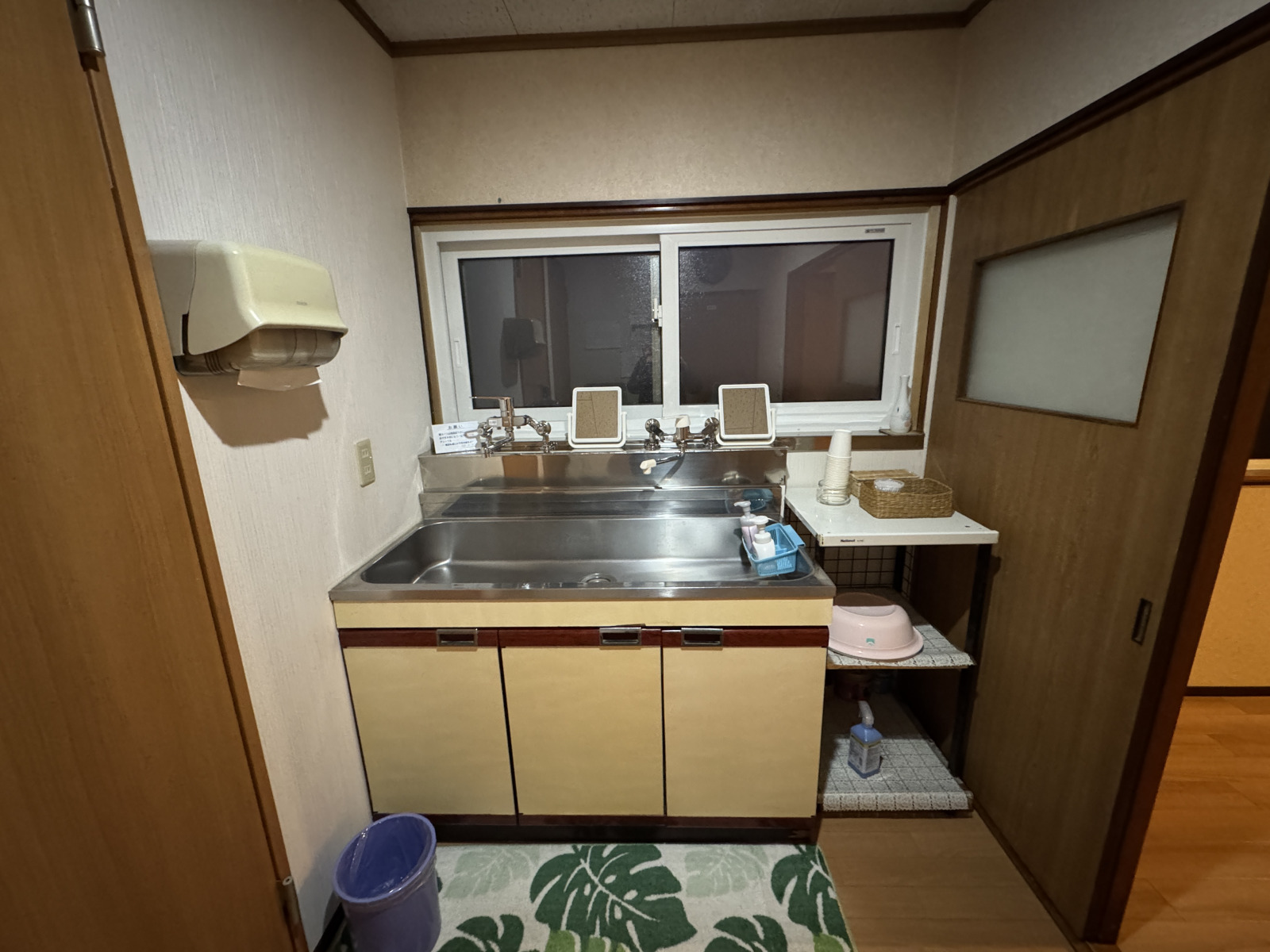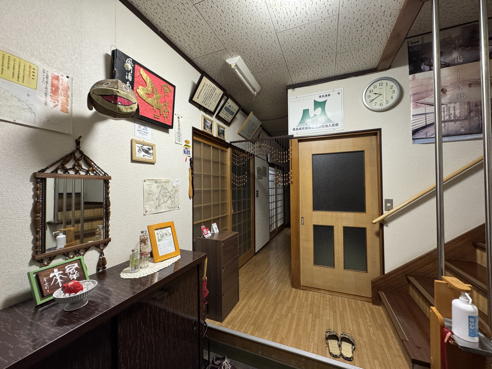 女将に出迎えてもらい、2階のお部屋へ。昭和55年、女将のお父様の代に創業した歴史ある民宿ですが、館内は隅々まで手入れが行き届いていて、居心地の良い雰囲気です。共同の洗面所とトイレも清潔感があり、アメニティ類には女将の細かな気遣いが感じられます。