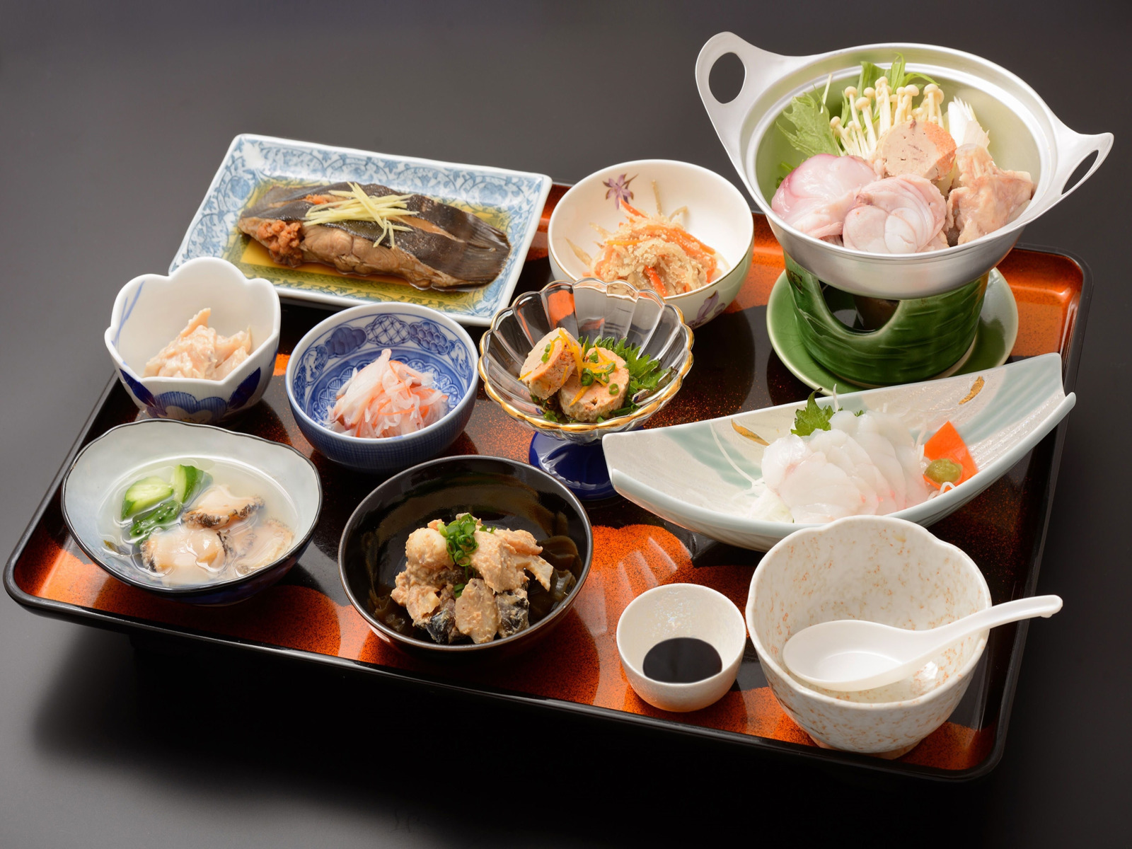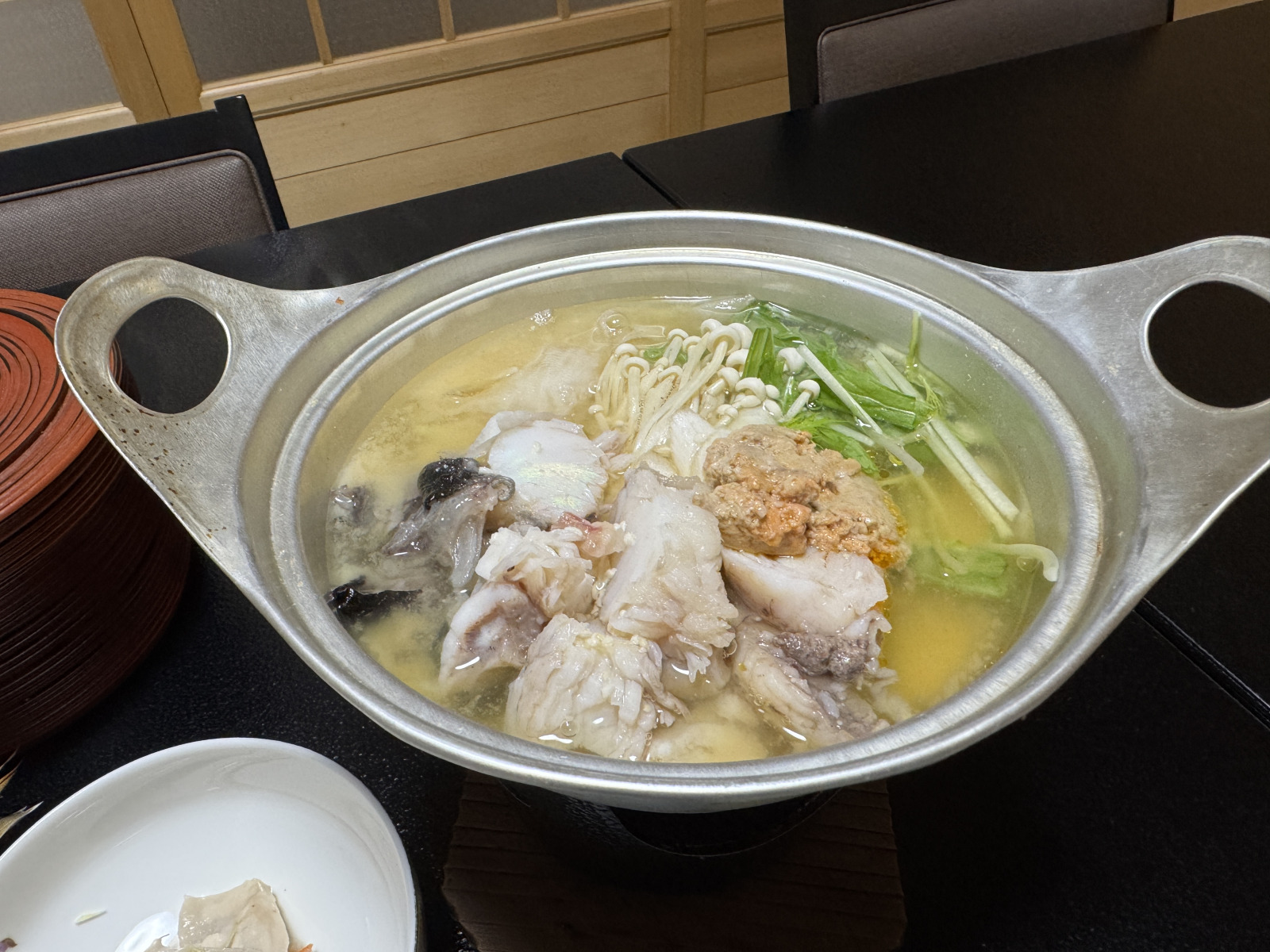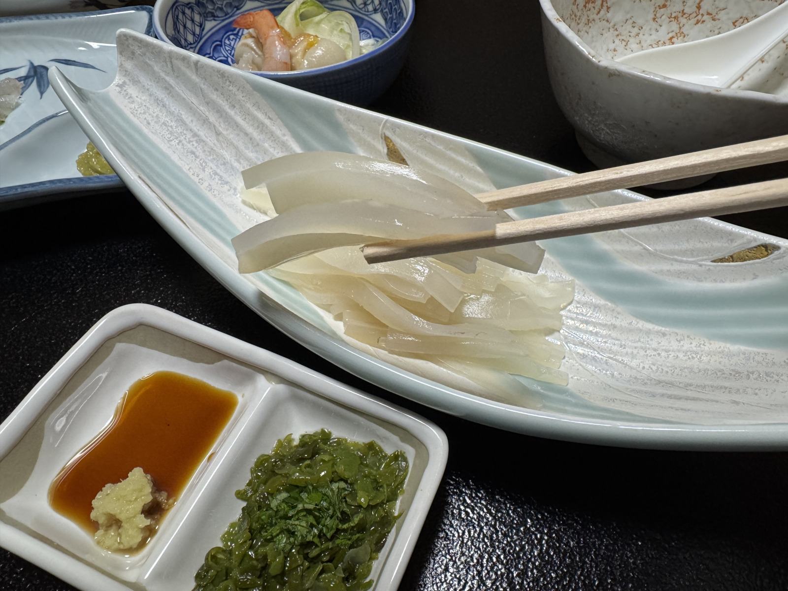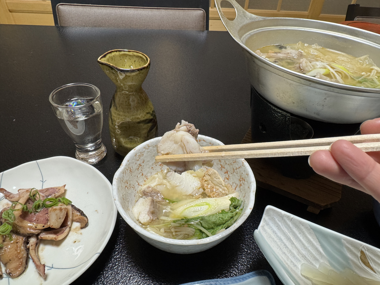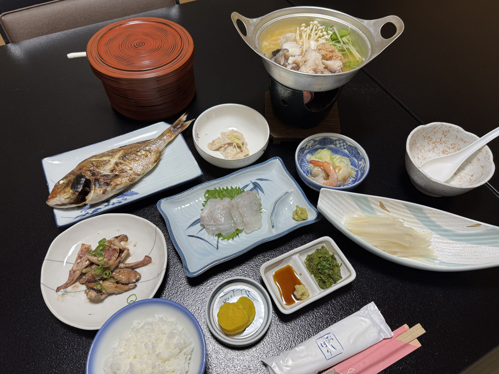 部屋に着くと程なくして、夕食の準備ができましたよ~と女将の声が。1階の食事会場に降りて席につくと、女将がひとつひとつ料理の説明をしてくれます。