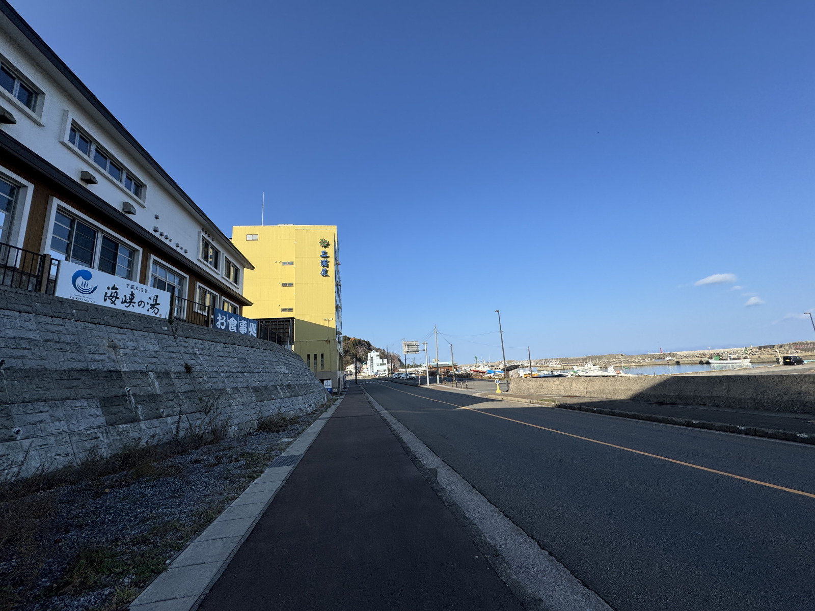 翌日の下風呂は雲ひとつない青空が広がっていて、目の前の海のあちこちで漁をしている漁船を眺めながら、温泉郷内に数店舗ある商店をはしごし、お土産にべこもちと関乃井を購入しました。