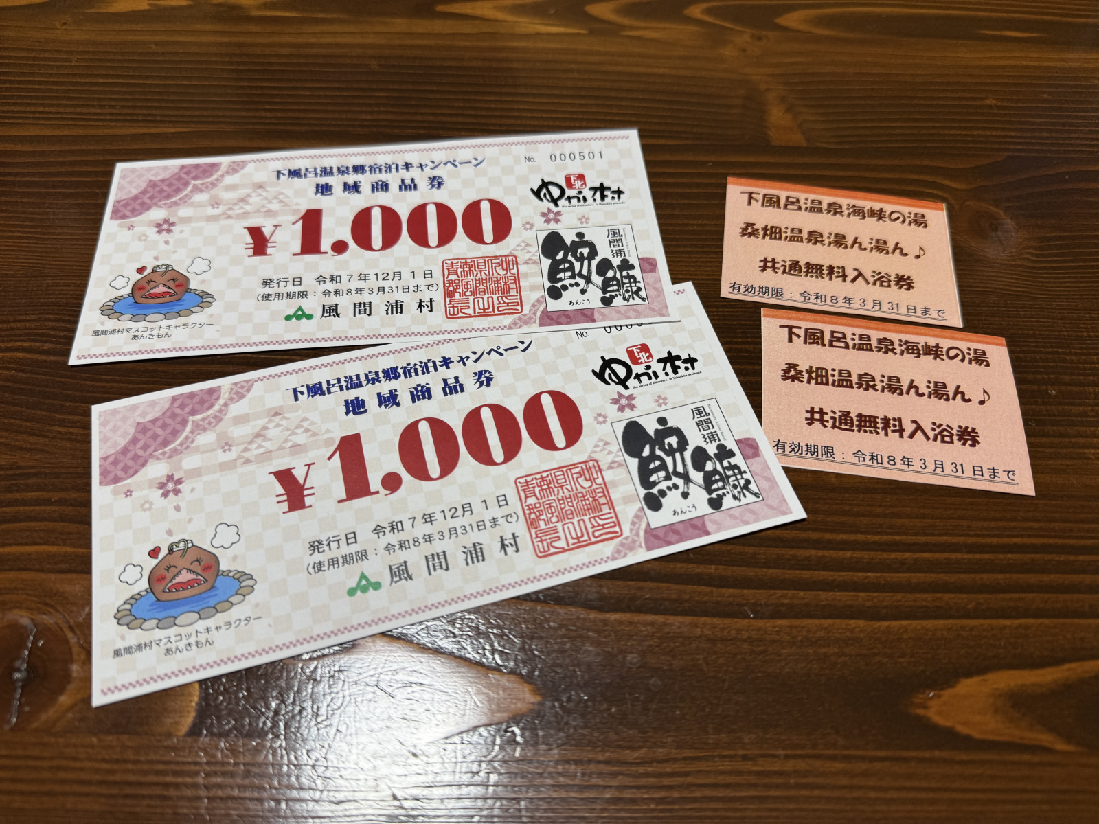 「下風呂温泉宿泊キャンペーン」では、これまで紹介した特典のほかに、飲食店やお土産店など、風間浦村内の取扱店舗で利用できる1人1,000円分(1,000円券×1枚)の商品券も付いてくるので、宿泊のついでにお得に買い物や飲食を楽しめちゃいます!(利用可能店舗は公式HPをご確認ください)