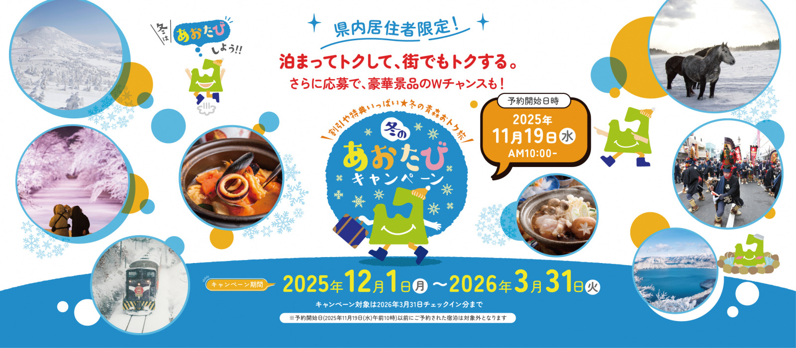 青森県民の皆さんに冬の青森をもっと楽しんでもらうための宿泊キャンペーン「冬のあおたびキャンペーン」も同時期に開始となりますので、「下風呂温泉宿泊キャンペーン」との併用で、ダブルでお得に宿泊することができます!