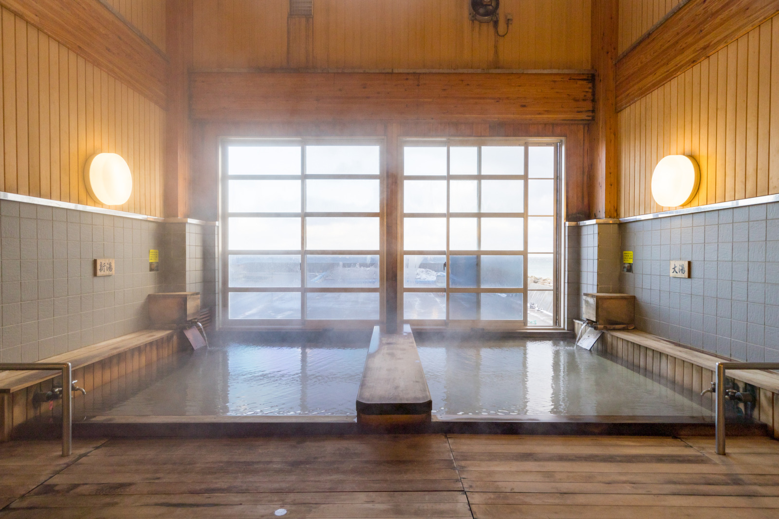 「下風呂温泉 海峡の湯」は、かつての共同浴場「大湯」「新湯」を統合し、 2020年12月に新オープンした日帰り入浴施設です。ヒバ造りの浴場では、源泉の異なる硫黄泉として、乳白色のにごり湯「大湯」と、やや透明でキリッと熱めの「新湯」をそれぞれ楽しむことができます。