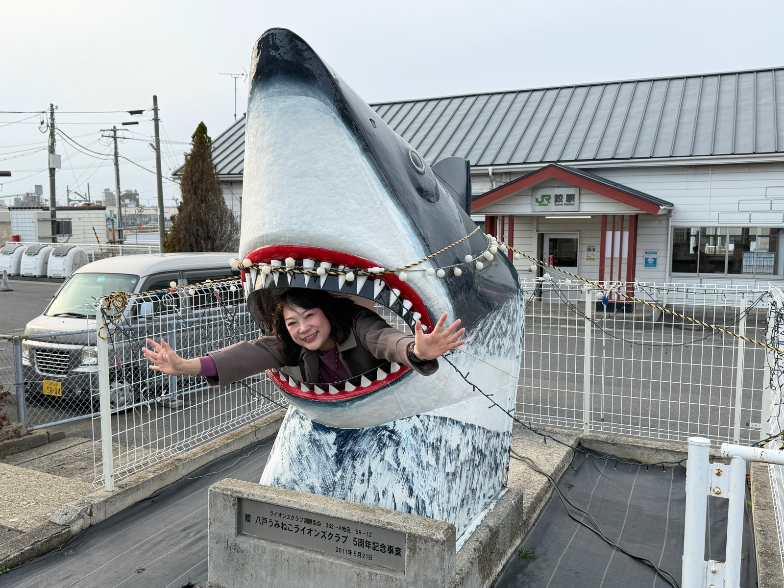 今度は鮫駅へ移動しましょう。鮫駅前には、鮫のオブジェがあり、中に入って写真を撮ることができます。だいぶ前に来た際に撮った写真と見比べてみたら、同じポーズをしていました。人ってそうそう変わらないですね。