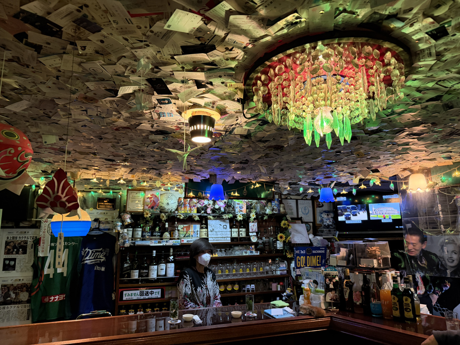 食後は魅力的な屋台が並ぶ、みろく横丁をぶらぶらと歩いて、「洋酒喫茶プリンス」へ。一見入りにくそうなドアを開け、入るとびっくり! きらびやかな店内、そして天井一面に名刺がびっしり貼られていました。