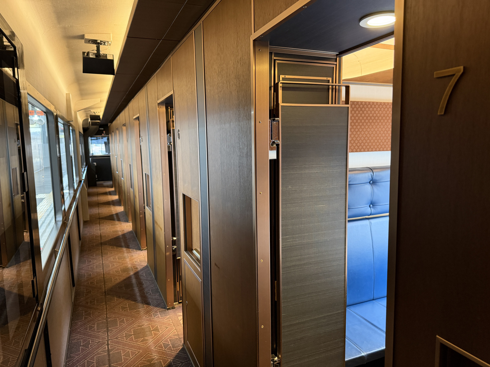 列車は3両編成で、1号車が「コンパートメント個室車両」。1室ずつに壁と半ドアがあり、7つの個室になっています。今回の私の席はここ1号車にあります。