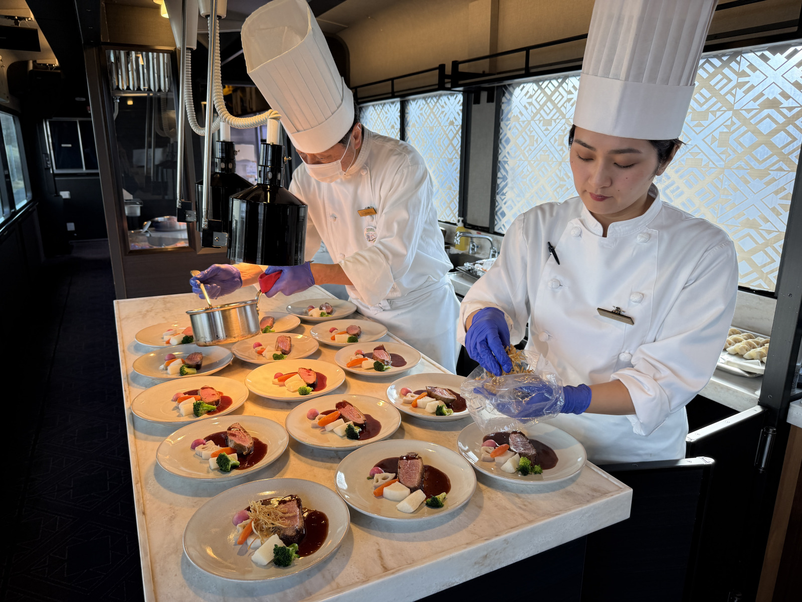 2号車は「ライブキッチンスペース車両」で、こちらでシェフが料理を作っています。ずらりと並んだお皿も壮観です。