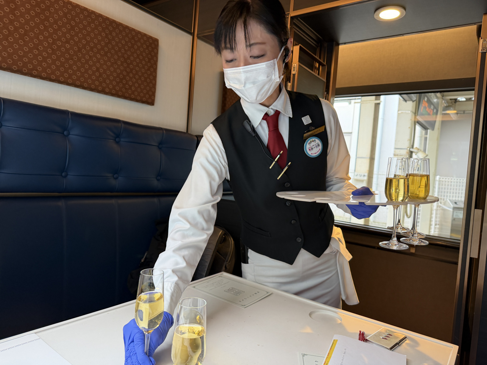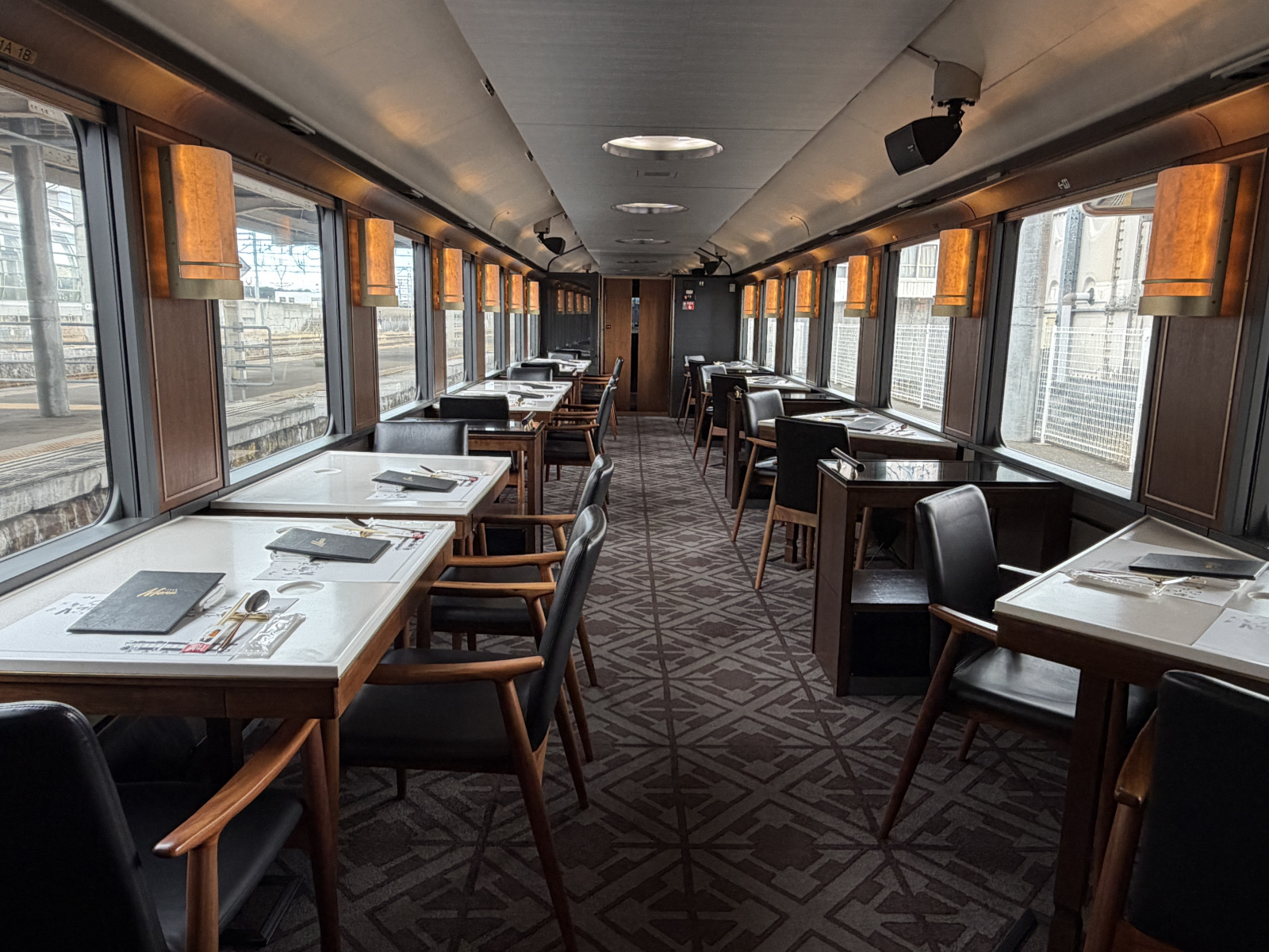 10時55分、ドアオープン。本物のレストランのようにドア横では支配人が出迎えてくれました。乗車証を見せて乗り込みます。