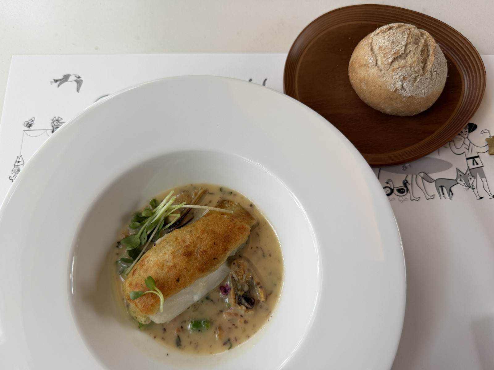 2皿めは魚料理が出てきました。真鱈のヴィエノワーズ ソースブールダルグ。鱈はさっぱりしたお魚ですが、片面がカリッと焼かれていて、ソースと共に食べると濃厚な味わい。付いてきたパンもおいしくて、残ったソースを付けてパクパクと食べきりました。