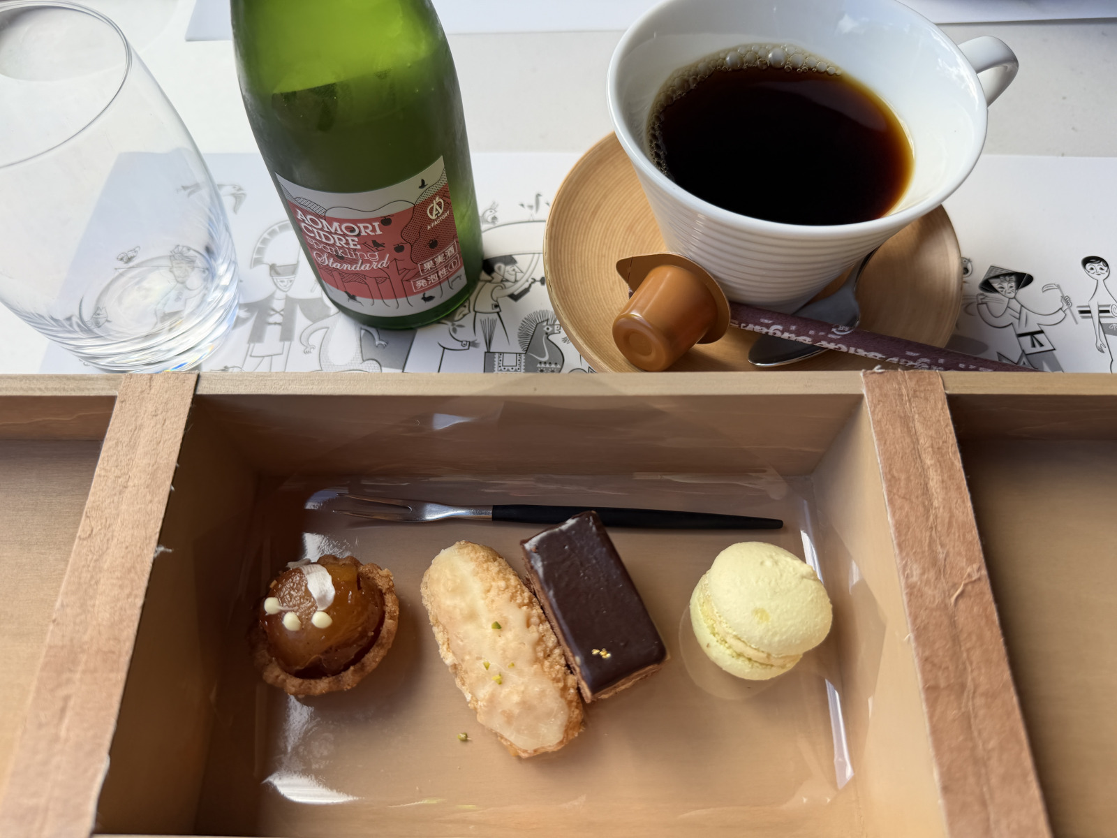 最後にデザートの箱が提供されました。開けてみると、りんごのタルトレット、エクレアシトロン、ミニオペラ、洋梨のマカロンの4種が入っていました。