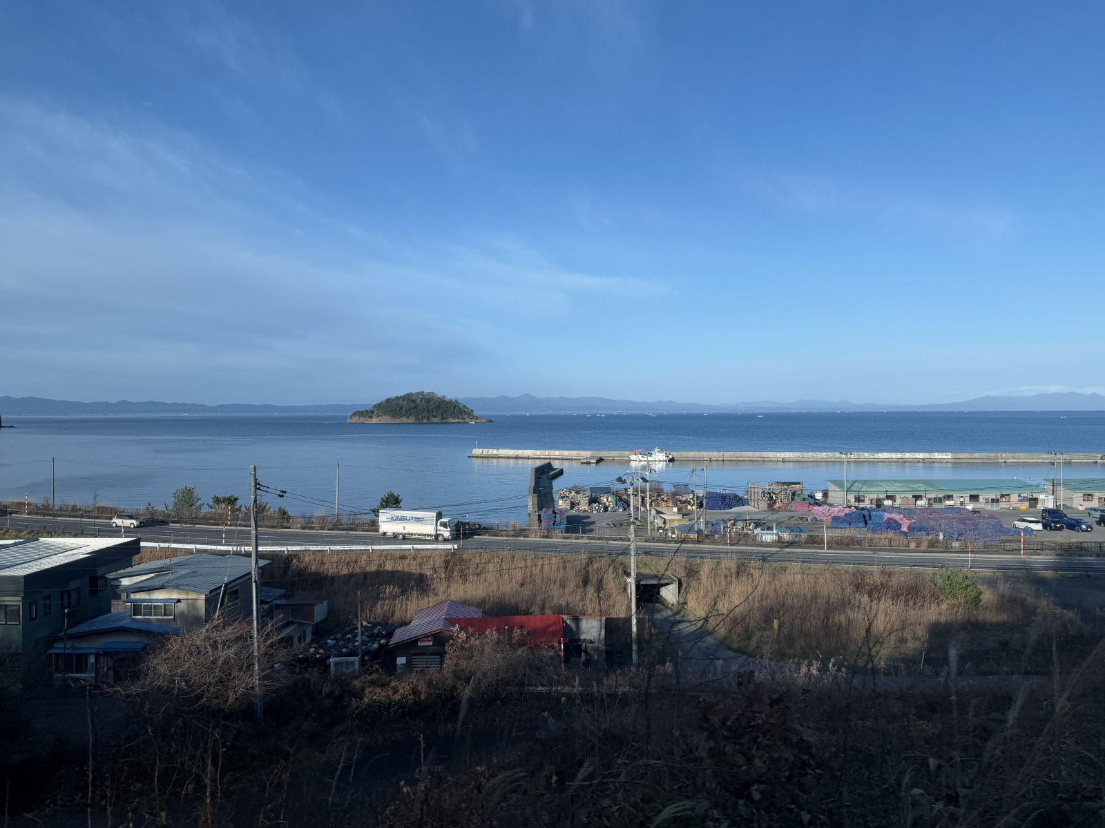その後、浅虫温泉あたりで左手に海が見えてきます。列車に乗っていて、海や川など水場を見つけると、なぜかテンションが上がりますよね。