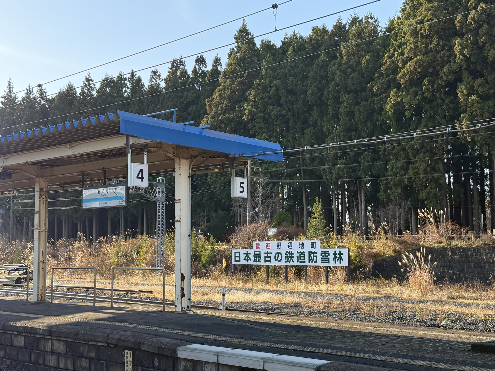 そして野辺地駅で下車。野辺地駅のホーム西側、2kmにわたる約700本の杉林は、日本最古の「鉄道防雪林」として、鉄道記念物に指定されています。ホームにも大きく看板があるのを見たことがある方は多いはず。これによって、雪害から線路が守られているのです。