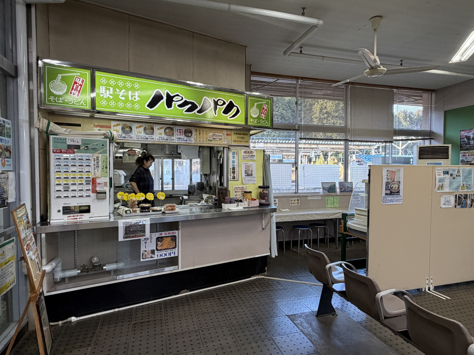 野辺地駅にある駅そば店は「駅そばパクパク」。パクパク、というネーミングがかわいいです。ここは営業時間が8時半〜14時と短いので、巡るなら真っ先に行った方がよいでしょう。
