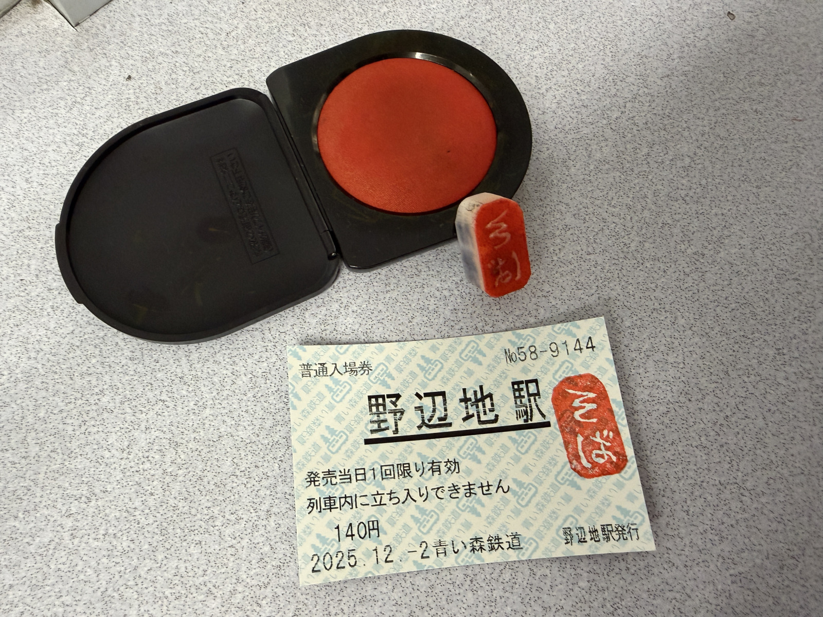 フリーきっぷなどを持っていればホームには出入り自由ですが、入場券を買うと、駅長の長渕さんお手製の消しゴムはんこで「そば」という文字をペタリと押してもらえます。ガタイの良い長渕さんが、小さな消しゴムはんこを、せっせと掘られていたのかと想像すると微笑ましいです。