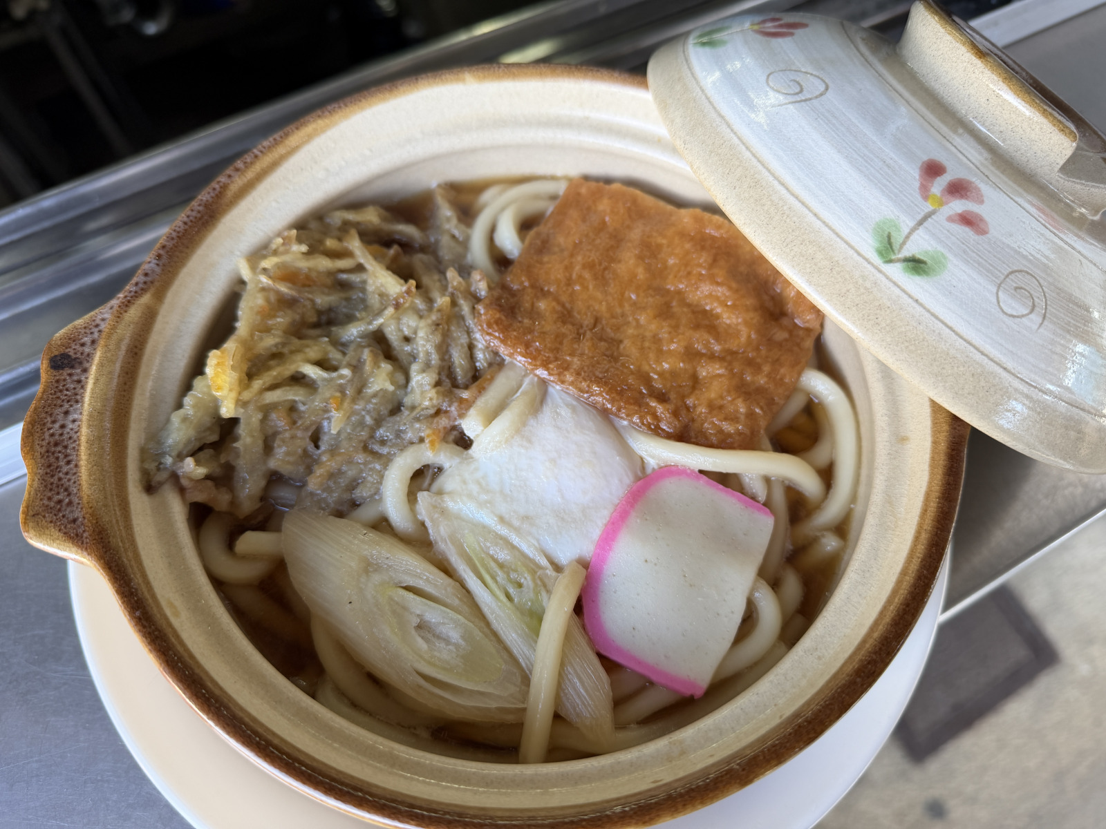 鍋焼きうどんはちょっと時間がかかります。急いでいる人にはおすすめしません。とはいっても鉄道で移動しているのであれば、次の便までたいてい時間があるので大丈夫でしょう。