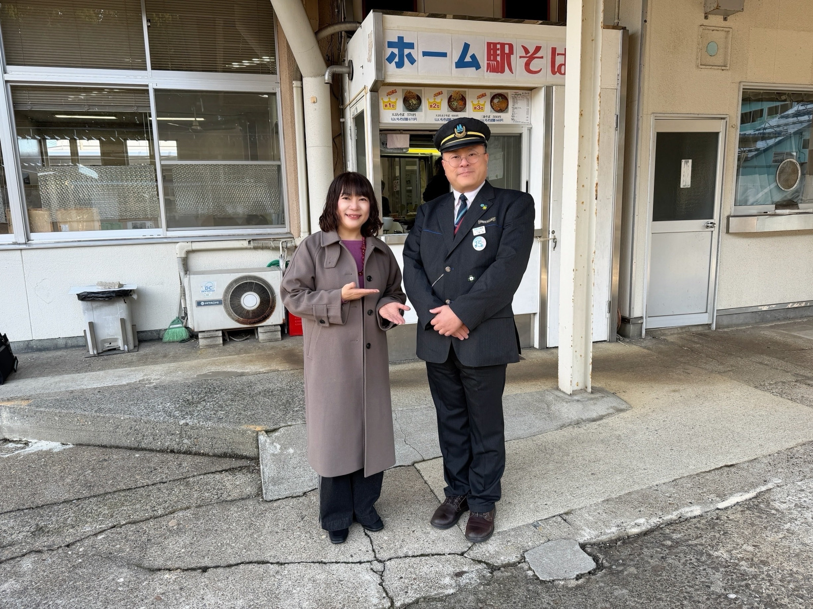 振り返ると野辺地駅の長渕駅長でした。初対面ですが、名物駅長との噂を聞いていたので、はじめましての気がしません。さっそく「ホームで食べたいのですが」と伝えます。