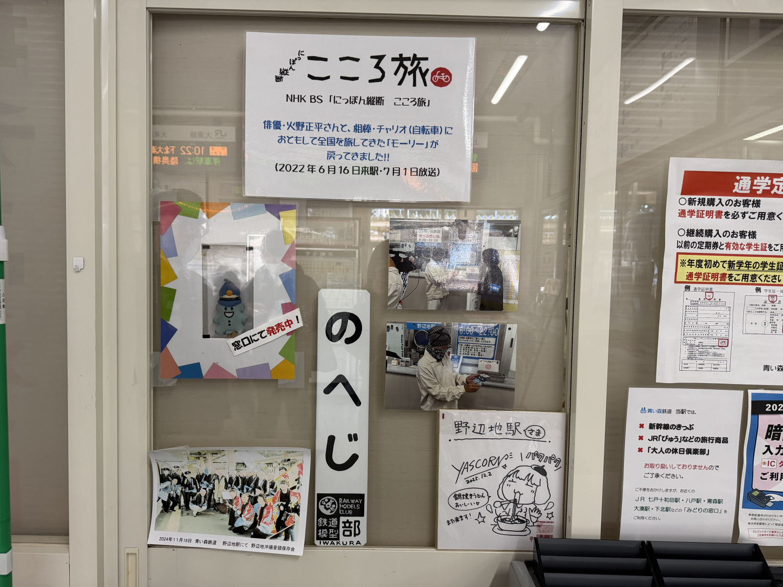 色紙は火野正平さんが全国を自転車で旅した際に持ち歩いた、モーリーの横に飾られています。行かれた方はぜひご覧ください。あ、モーリーとは、青い森鉄道のイメージキャラクターです。