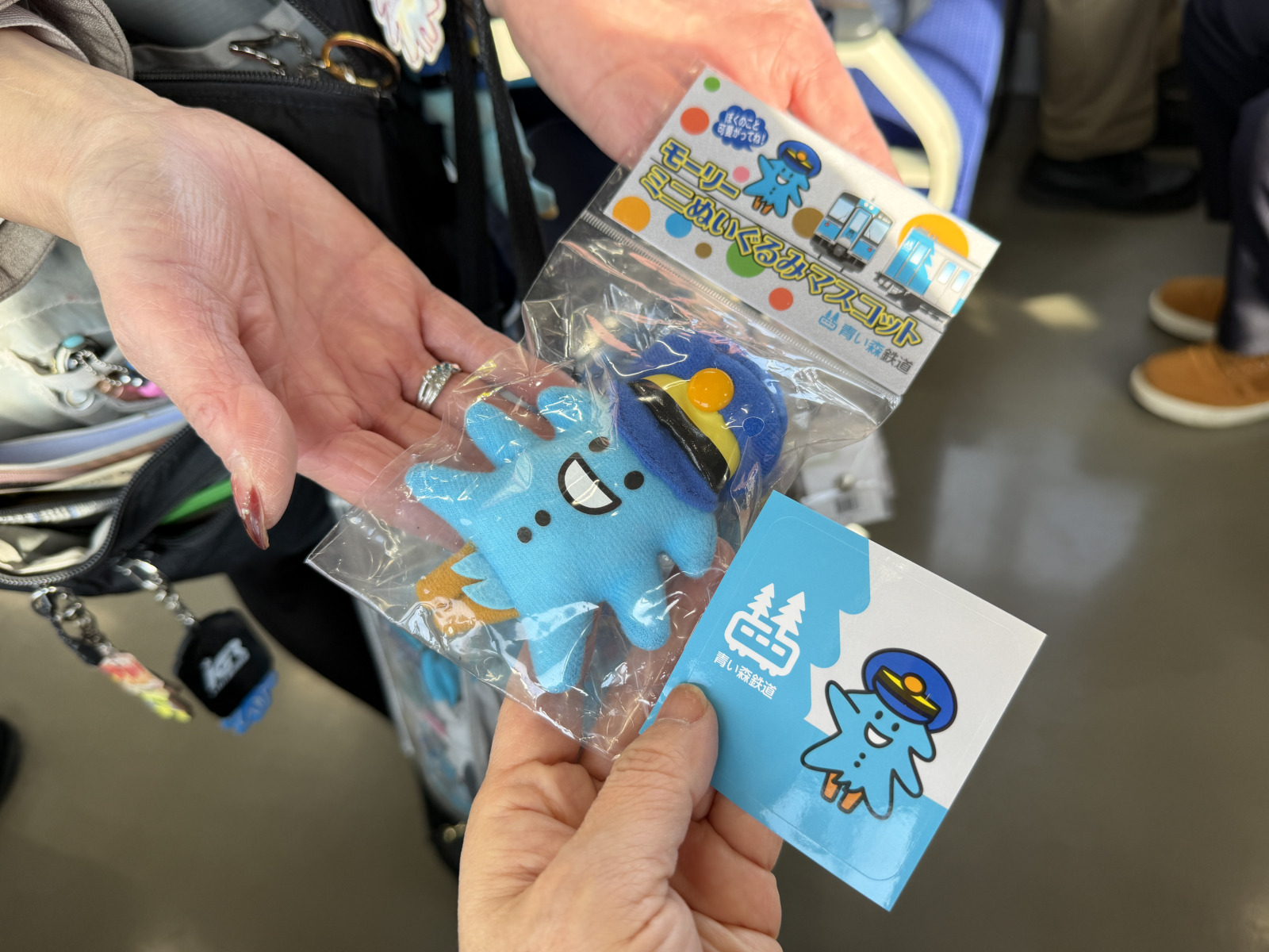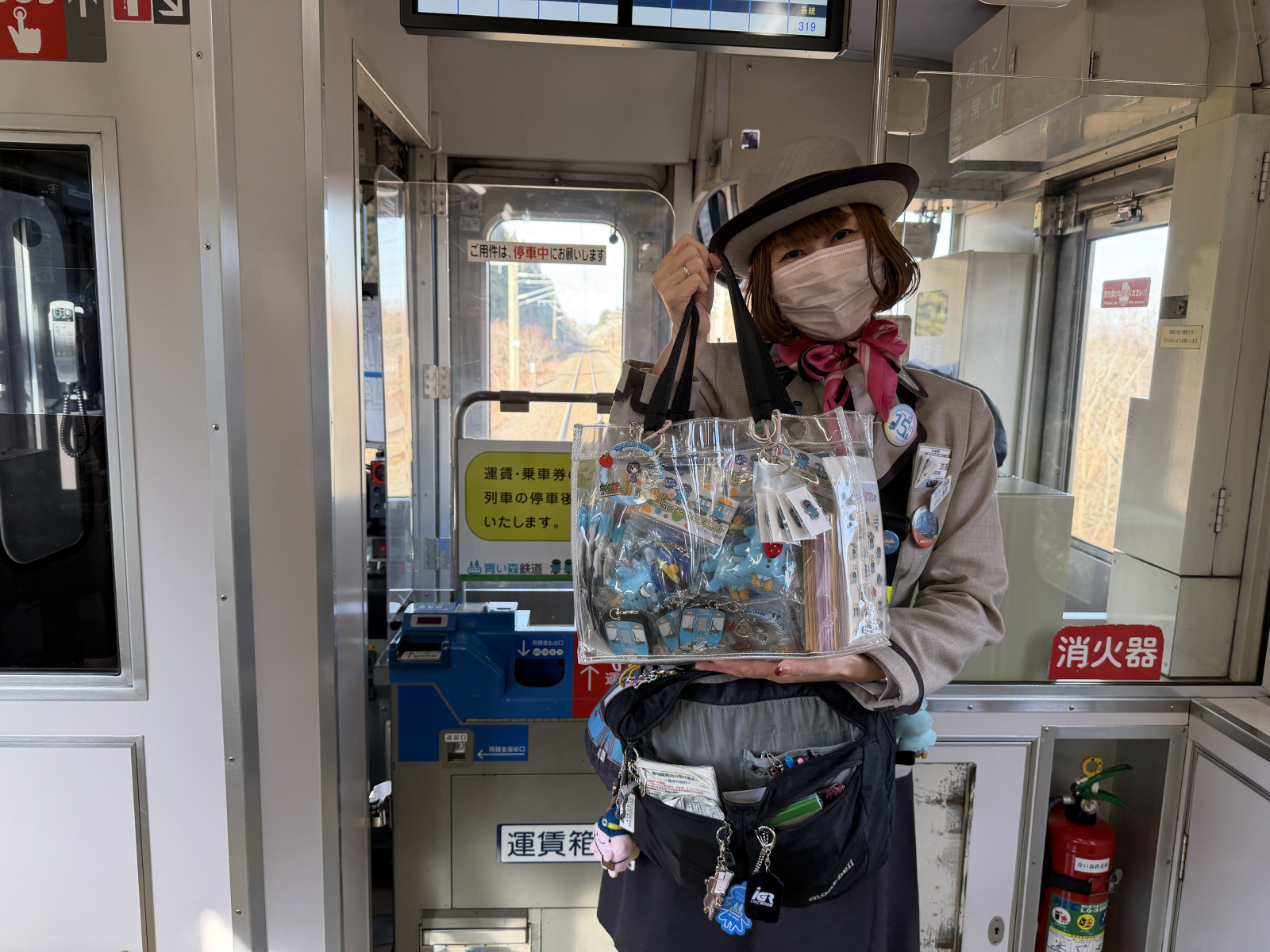 お世話になった長渕駅長とお別れし、再び列車で移動。車内にはアテンダントさんがいました。車内での案内業務と兼任で、車内販売をされているようです。普通列車なのに、車内販売をしているなんて、全国的にもめずらしい。しかもいつもいるわけではなく、一日のうち数本のみだそう。青い森鉄道には何度も乗車していますが、初めて出会いました。