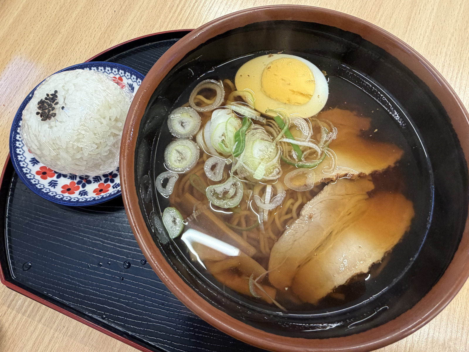 以前の三沢駅時代から毎回食べているのは、山菜、天ぷら、生卵が入った「スペシャルそば」。今回は別のものにしようかと迷っていたところ、新しい駅舎になってから誕生した新メニュー「駅そばラーメン」(おにぎり付き)をお店の方に勧められました。