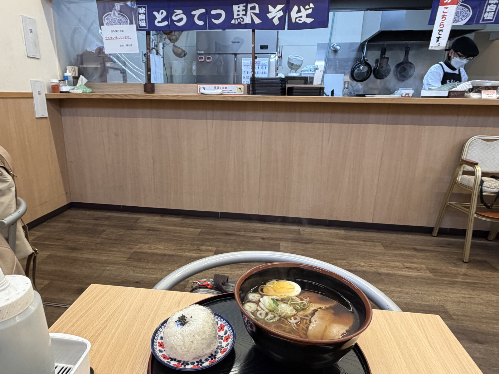 このメニューは、新しい駅舎で新しいものを作ろう、ということから考案されたそうです。おにぎりが付いているのは、麺だけだとボリュームが足りないかも、という優しさから。シンプルな塩むすびかと思ったら、中に梅干しが。出汁を飲みつつ、おにぎりもおいしくて、ペロリと食べてしまいました。