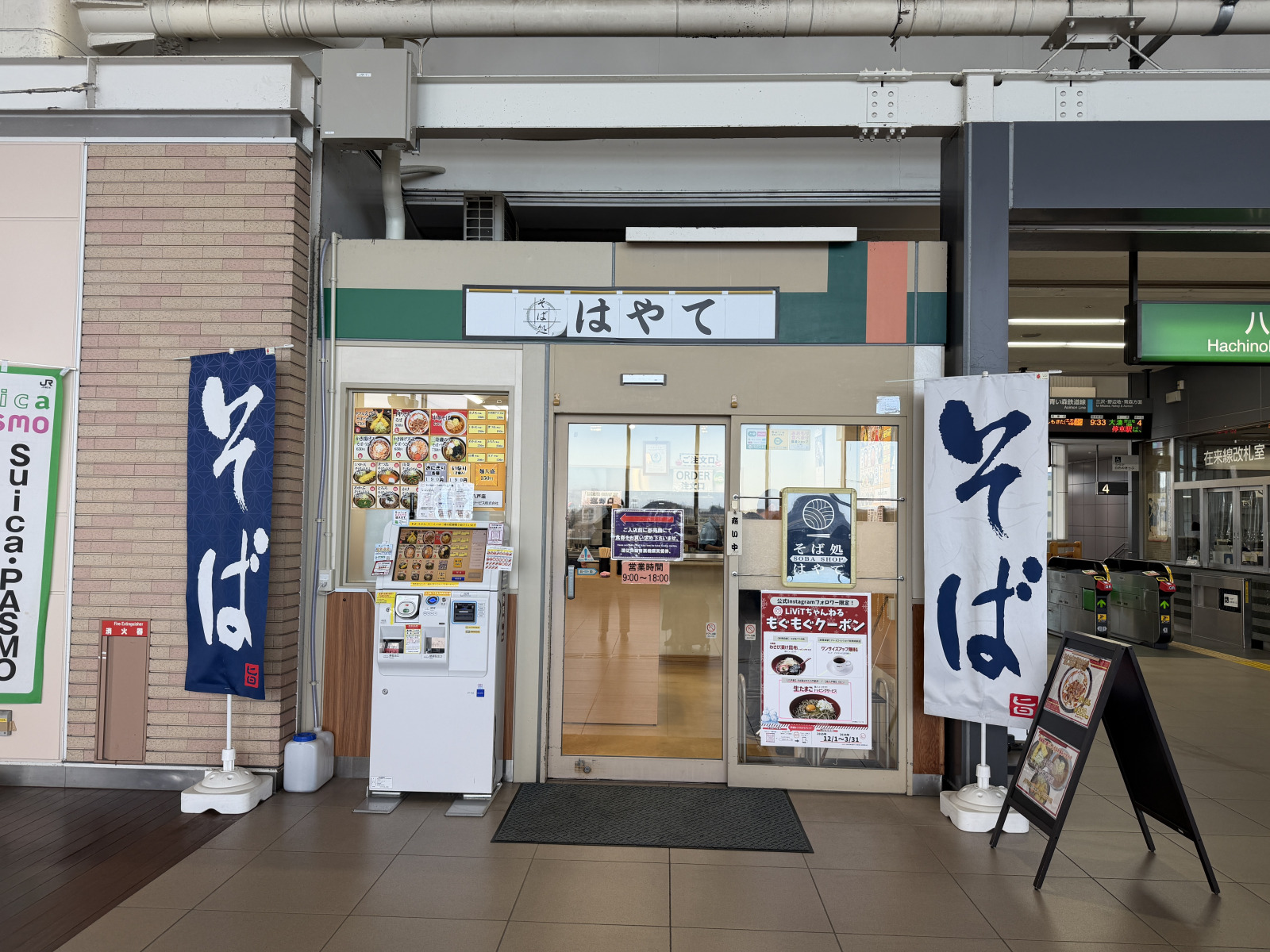 さて、そろそろお腹もこなれてきたので、3軒めの駅そばを食べに行きましょう。青い森鉄道で八戸駅に移動します。駅そば「はやて」はJR側の八戸駅改札すぐ横にありました。