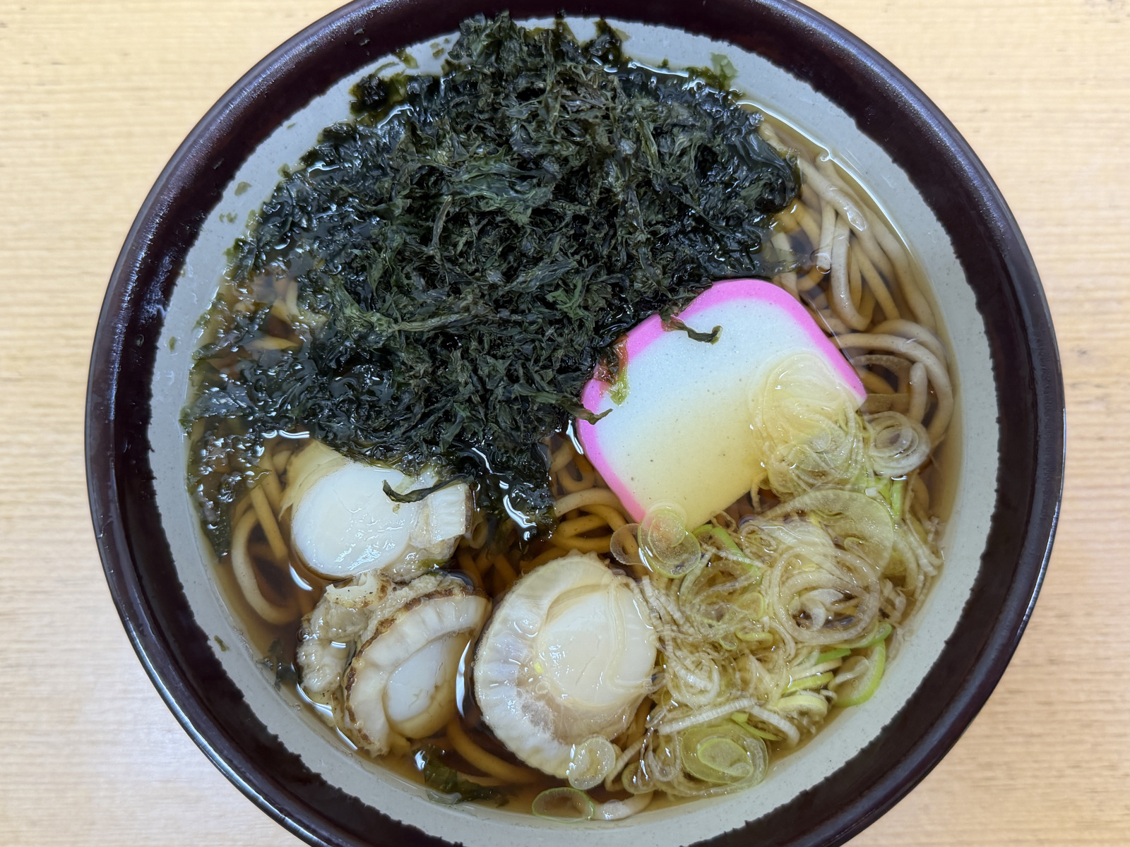 「三陸磯のりそば」は、出された途端、のりの香りがふわっと。かつおベースの醤油出汁は、少し甘いけど甘すぎず。やわらかめの麺に、ホタテ3つ、かまぼこ、ネギがのっています。ホタテは旨みがしっかりあっておいしい。磯ノリは食べるうちに出汁に溶けていき、後味がさわやかでよかったです。
