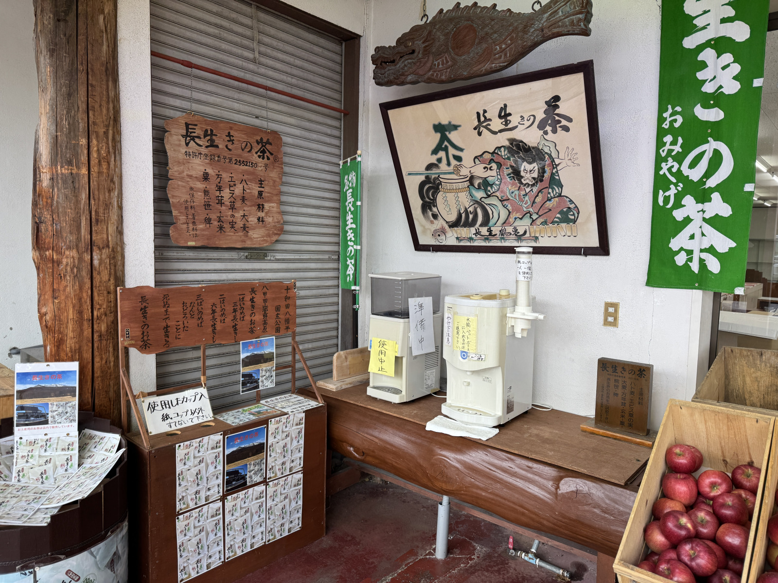 入口脇に二つの給茶機が見える。「長生きの茶」だ。木の板に書かれた材料はハト麦、エビス草の実、大麦、玄米、万年茸、熊笹、稗(ひえ)、粟の8種。このお茶は「1杯飲めば3年長生きし、2杯飲めば6年長生きし、3杯飲めば死ぬまで生きられる」のだそうだ。