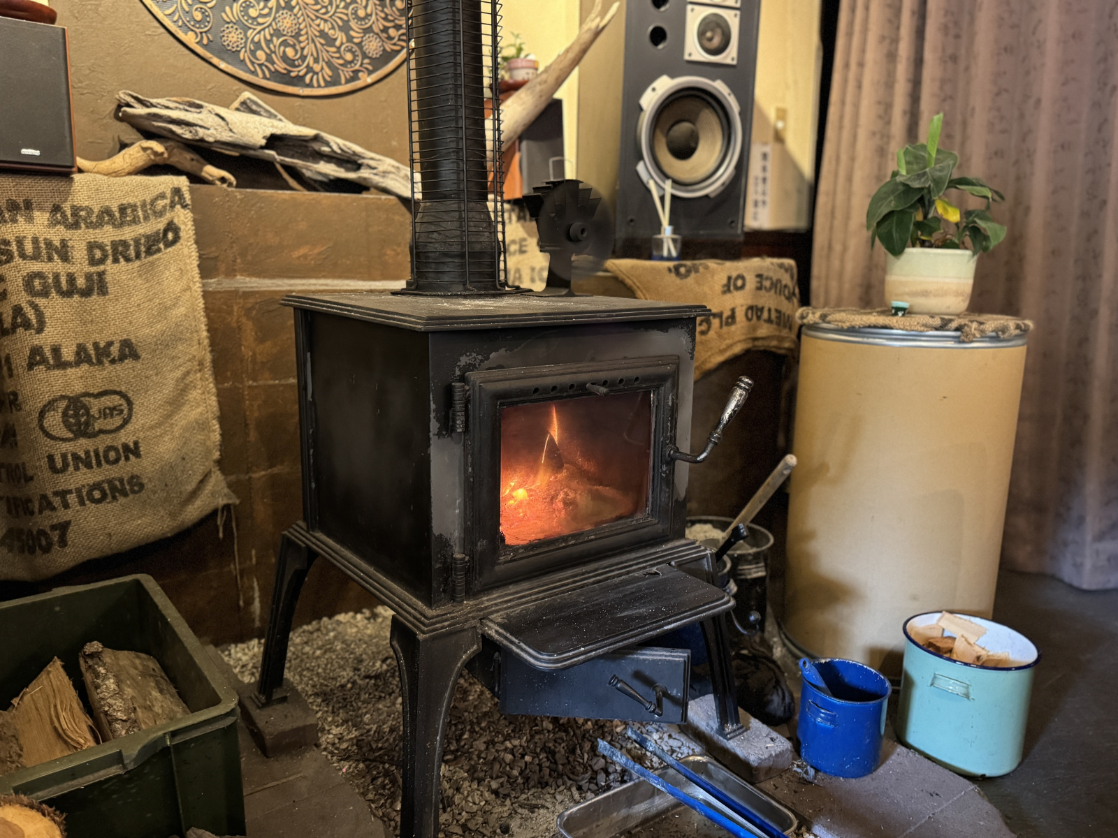 やがて紙コップに入ったコーヒーが運ばれてきた。私はふだん遠方から焙煎仕立てのコーヒー豆を送ってもらっているので、少しだけコーヒーの味はわかる。コーヒーを一口含んで、赤い炎がちろちろと揺れる薪ストーブに目をやった。深い酸味からほのかな甘みが立ち上ってくる。ご主人が「飲ませたい」といった意味がよくわかった。