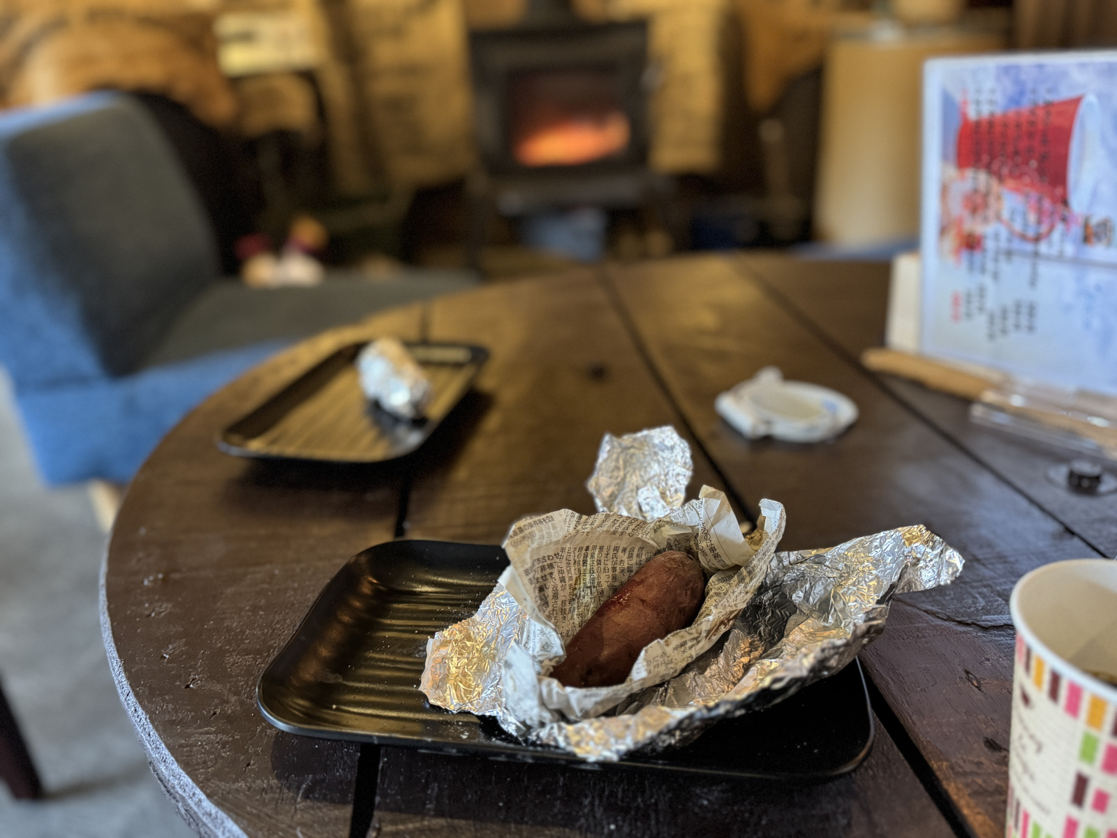奥さんが薪ストーブの扉を開いて、銀色の塊を取り出した。中でサツマイモを焼いていたのだ。アルミフォイルの下に新聞紙、その下からほくほくのサツマイモが現れた。「どうぞ食べてください」と奥さんがサツマイモをソファのテーブルに置いてくれる。ふらっと寄った客に対するその優しさに心が温まった。