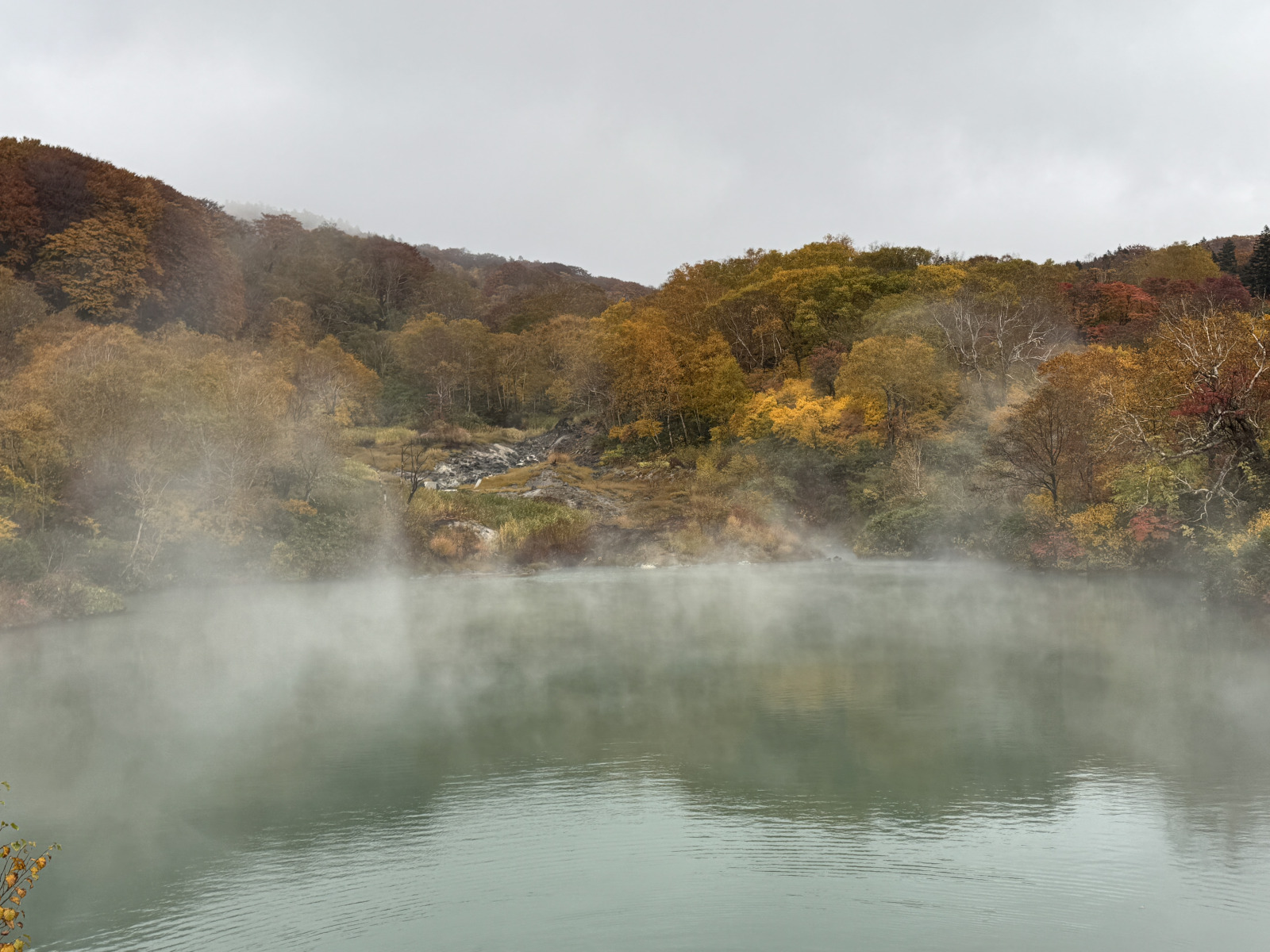 蔦沼の手前に何台もの車が止まっているスポットがあった。降りてみたら、そこは地獄沼だった。沼からは盛大に湯気が立ち上っている。沼の水温は90度、強酸性だから、沼に生き物はいない。道路から沼の縁まで降りたグループはアジア系の観光客のようだ。スマホをかざして写真を撮りながら、歓声をあげている。