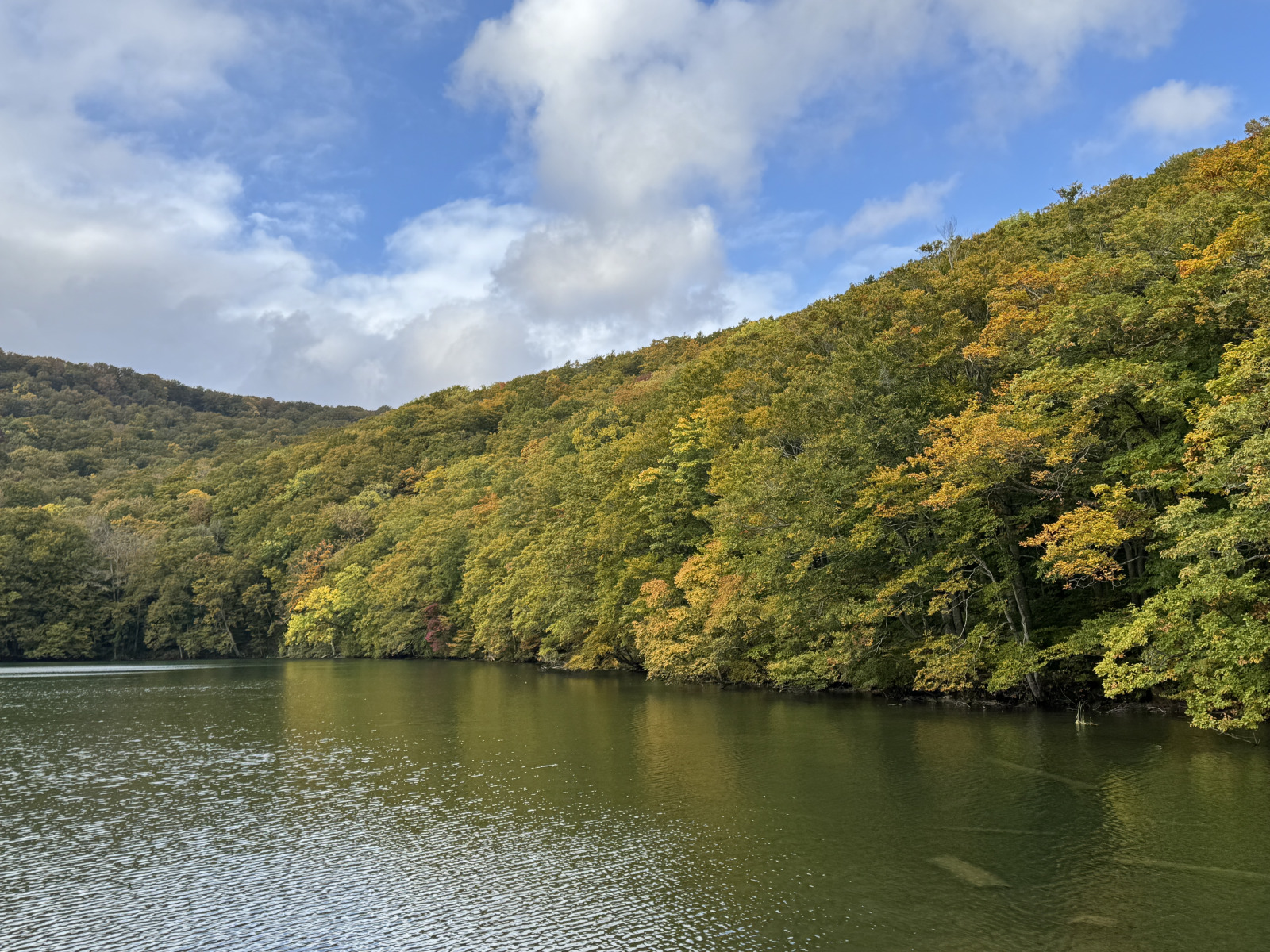10分ほど歩いただろうか。ふいに視界が開け蔦沼が見えてきた。足元は木製の広い展望台になっている。紅葉はまだだ。色づき始めたというところだろう。