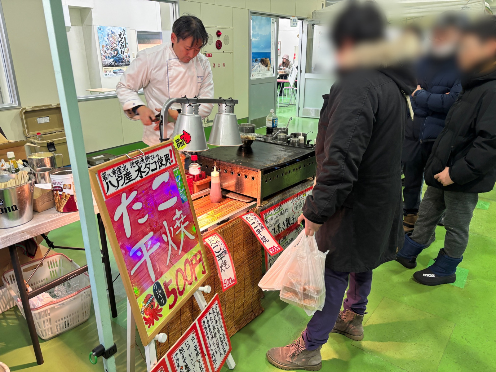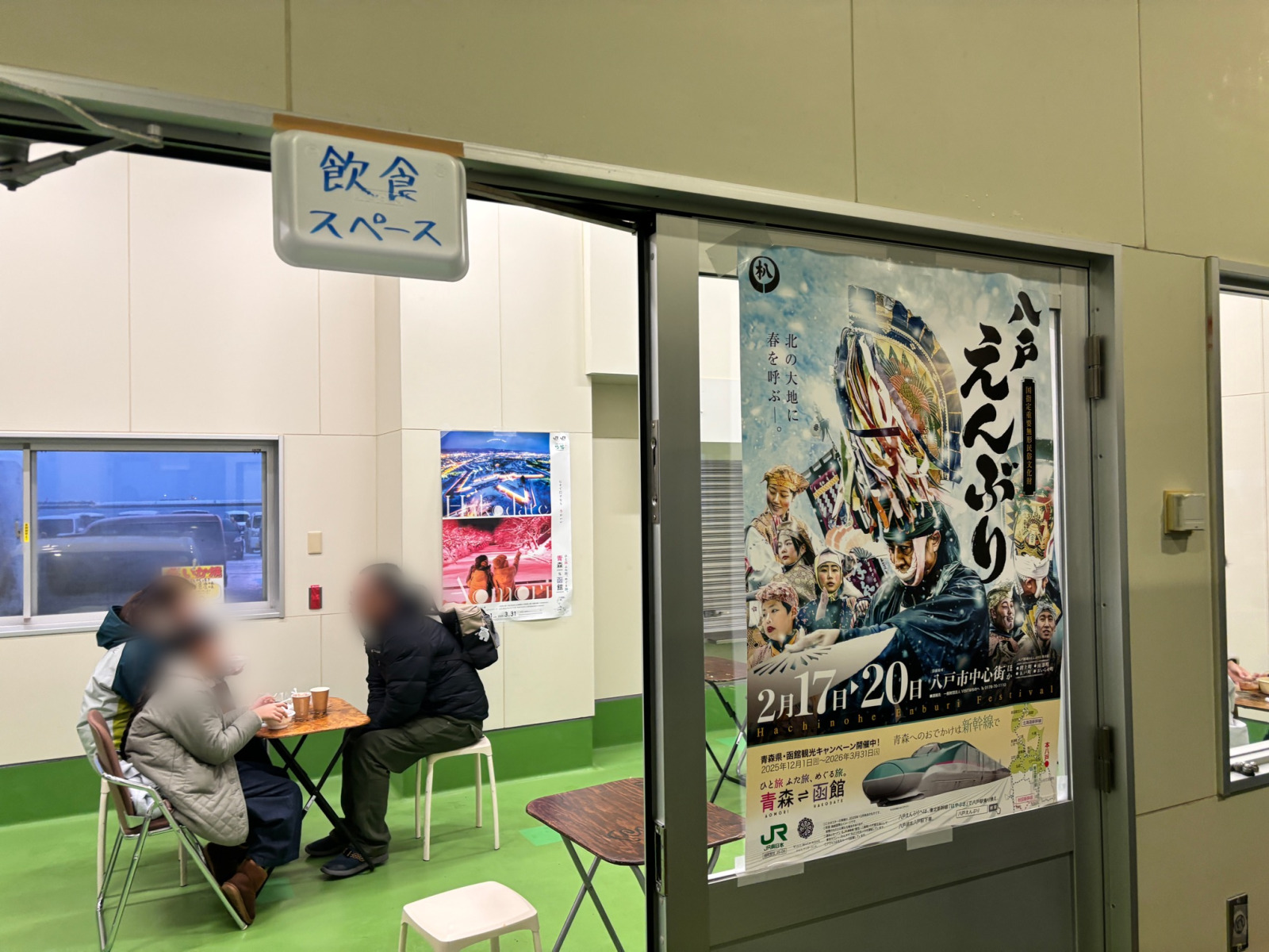 中には飲食スペースが何ヶ所か設置されており、テーブルと椅子が数セットずつ用意されているので、外で寒い熱い美味しい!と食べるも良し!飲食スペースであずましく(ゆったりと)ぬぐだまって(暖まって)食べるも良し!各々のスタイルで八戸の食を堪能してください。