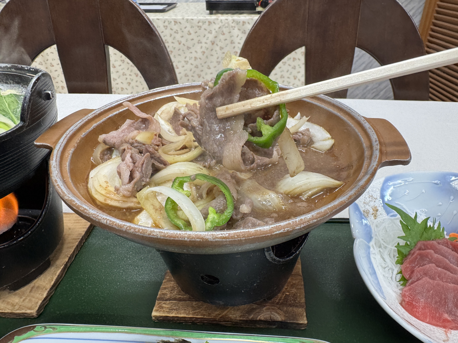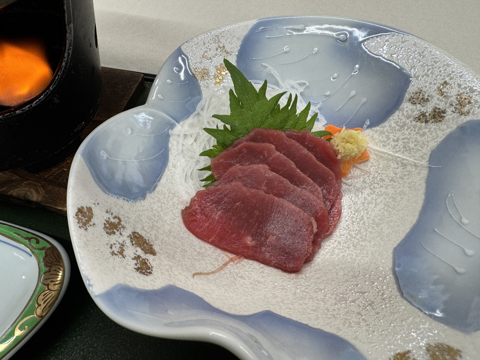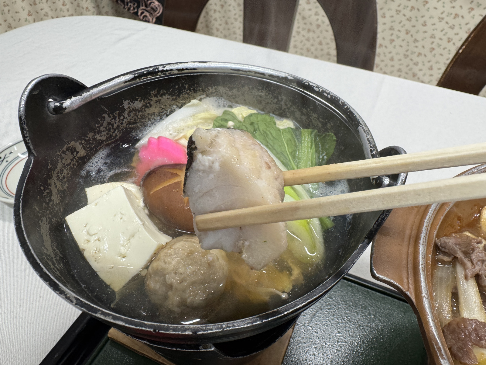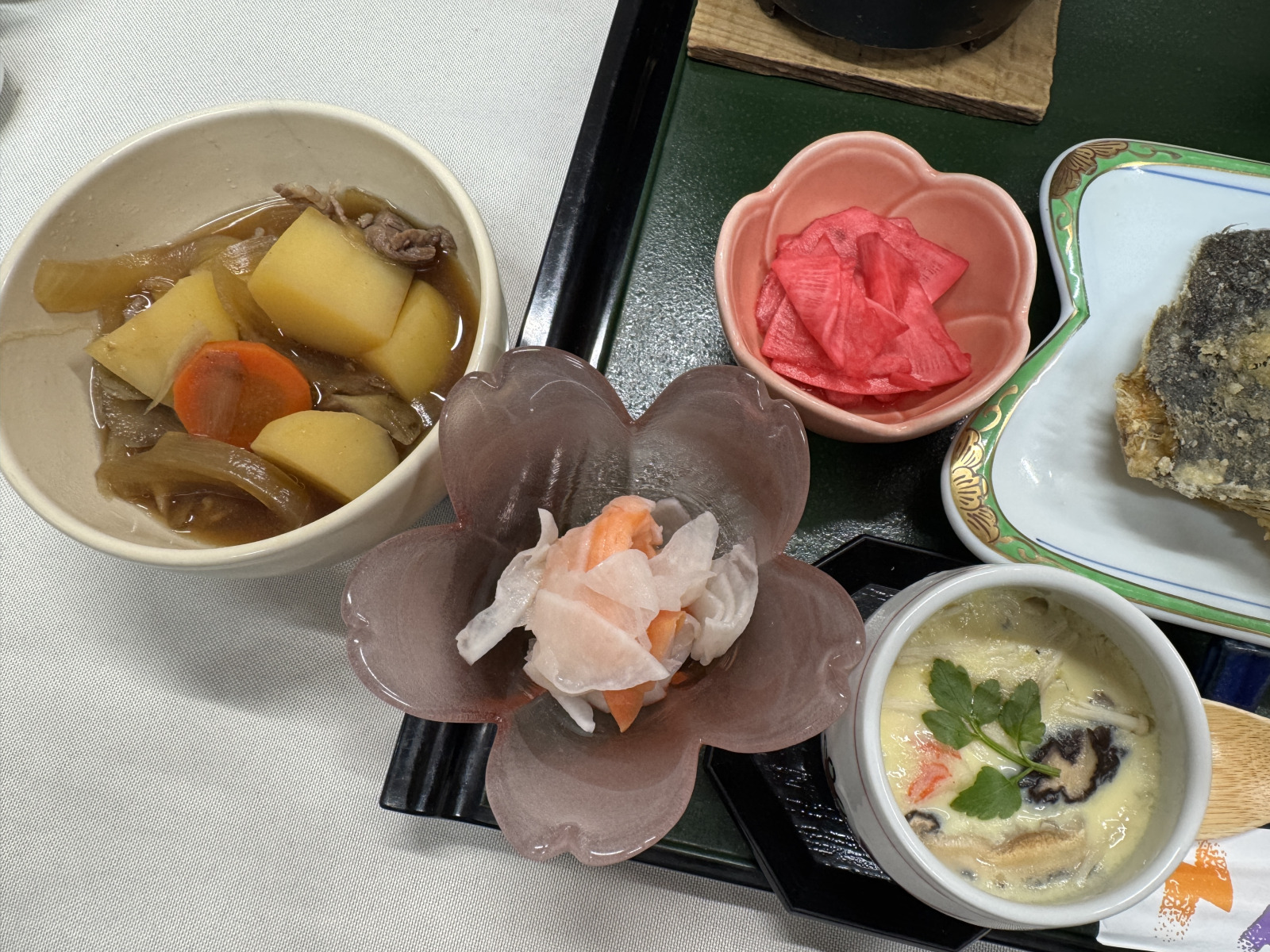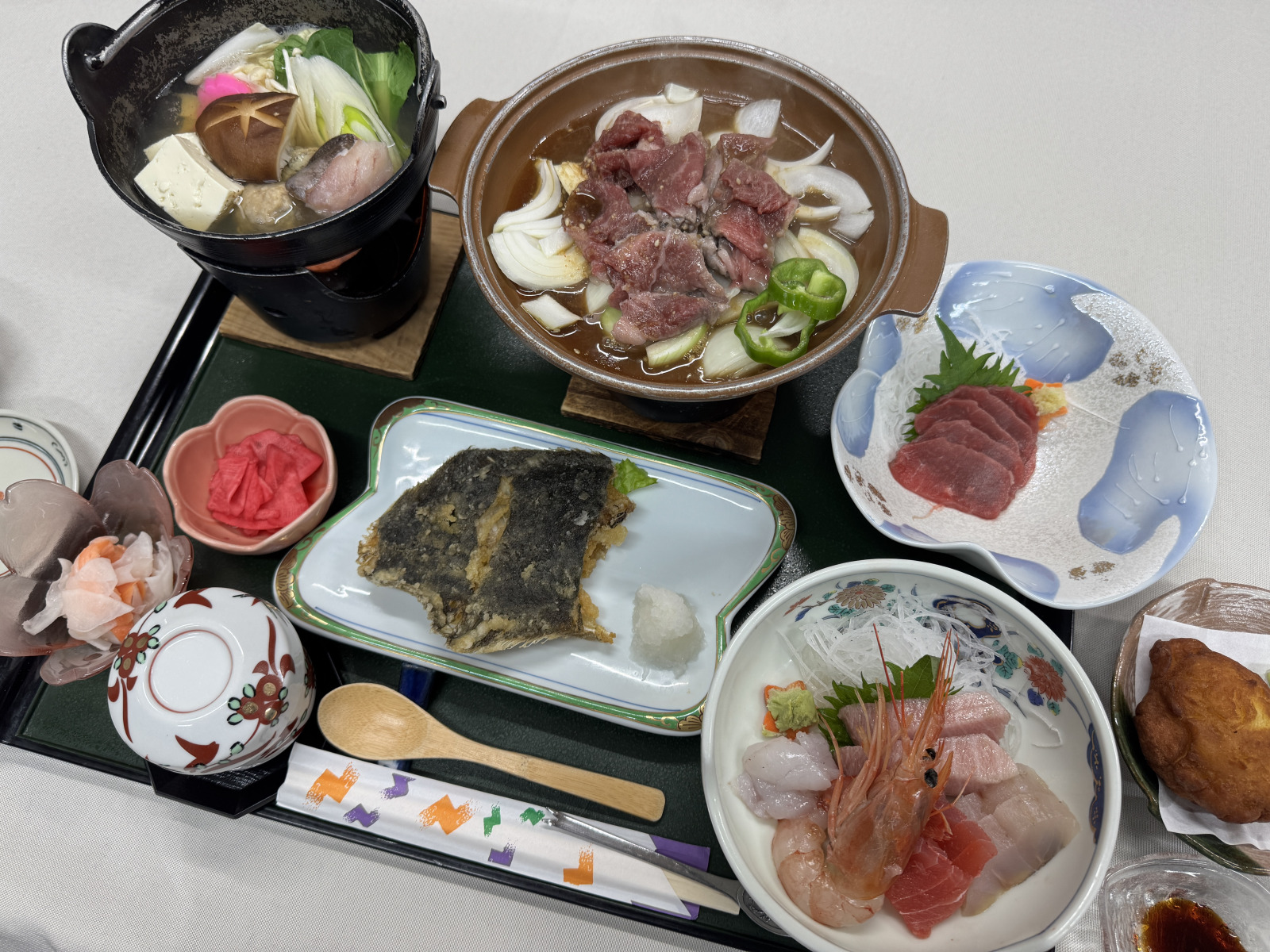 目玉メニューだけでなく、たら鍋やお刺身、カレイのから揚げ、女将手作りの小鉢類など、旅館料理でありながらも、家庭的な温かみを感じる食事の数々が並びます。
