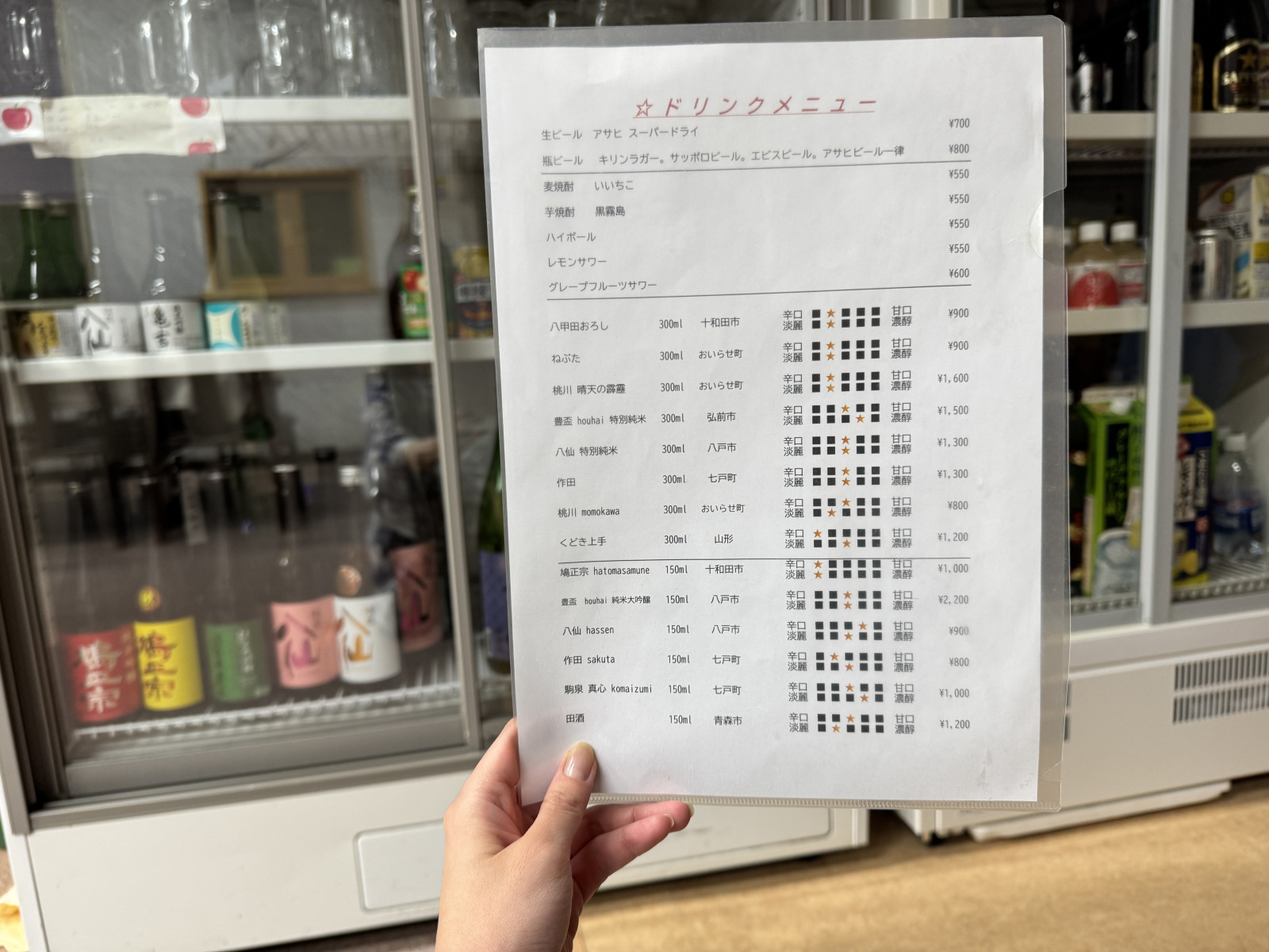 さらに嬉しいことに、ドリンクメニューも充実しています。なんとメニューリストの面積のうち約8割は青森の地酒!産地や味わいチャートまで書かれていて、これは頼まずにはいられません。