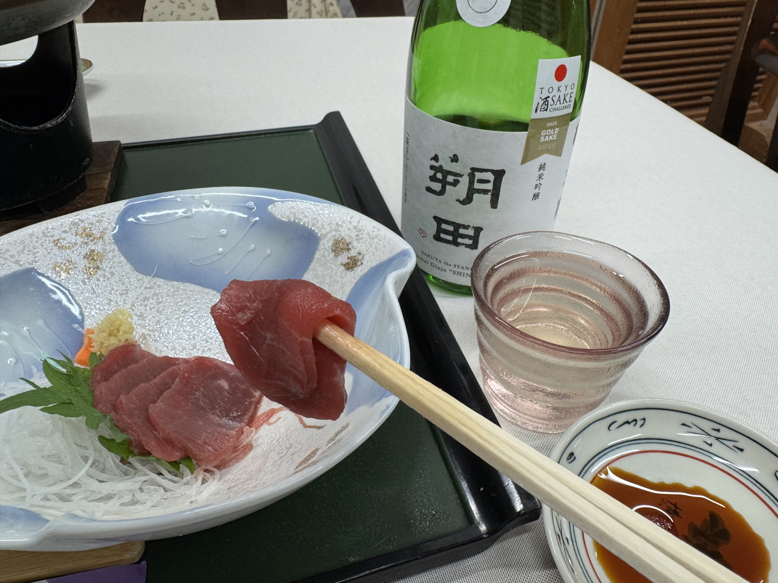 地酒リストからチョイスした七戸町「盛田庄兵衛」の「朔田(さくた)」を、馬刺しでクイっと。くぅ~、たまりません。控えめに言って最高です。