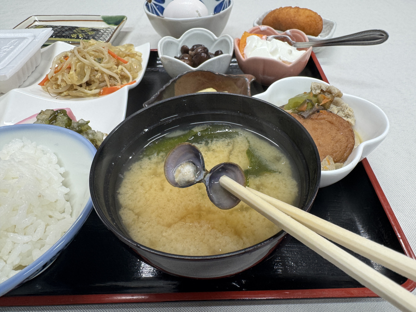 翌朝は、朝風呂後に朝食を(温泉は6時から入浴可能です)。小川原湖産のしじみを使った味噌汁が、五臓六腑に染み渡ります。朝食もほとんど女将の手作りで、煮豆やふきの入った煮物など、おばあちゃん家に行かないと食べられないような、昔ながらの家庭料理についご飯が進んでしまいました。