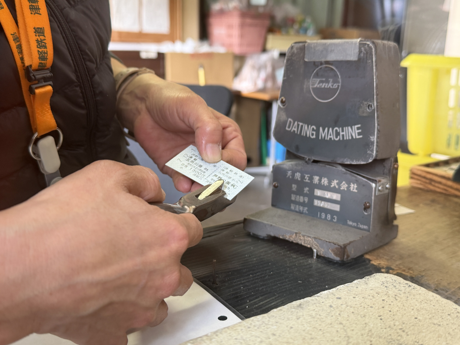 きっぷはダッチングマシンに通し、ハサミを入れる 津軽鉄道のきっぷは硬券です。硬券というのは、昔ながらの硬いきっぷのこと。これを見て、懐かしいと思われる方も多いのではないでしょうか。