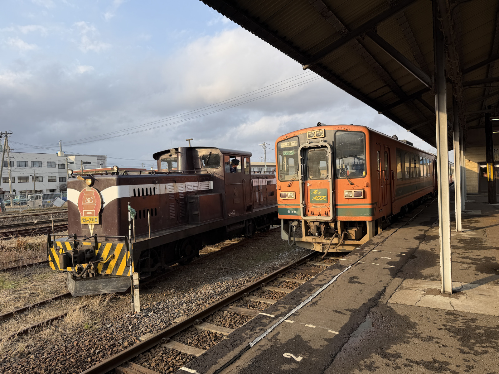 ホームに停車中のストーブ列車ちなみにきっぷは、ここで帰りの分も一緒に買っておきました。きっぷが売られている有人駅は津軽五所川原駅、金木駅、終点の津軽中里駅と限られています。無人駅から乗ると精算となり、きっぷは手元に残りません。私は硬券きっぷをコレクションしておきたい派なので、ここできっぷを買ったというわけです。