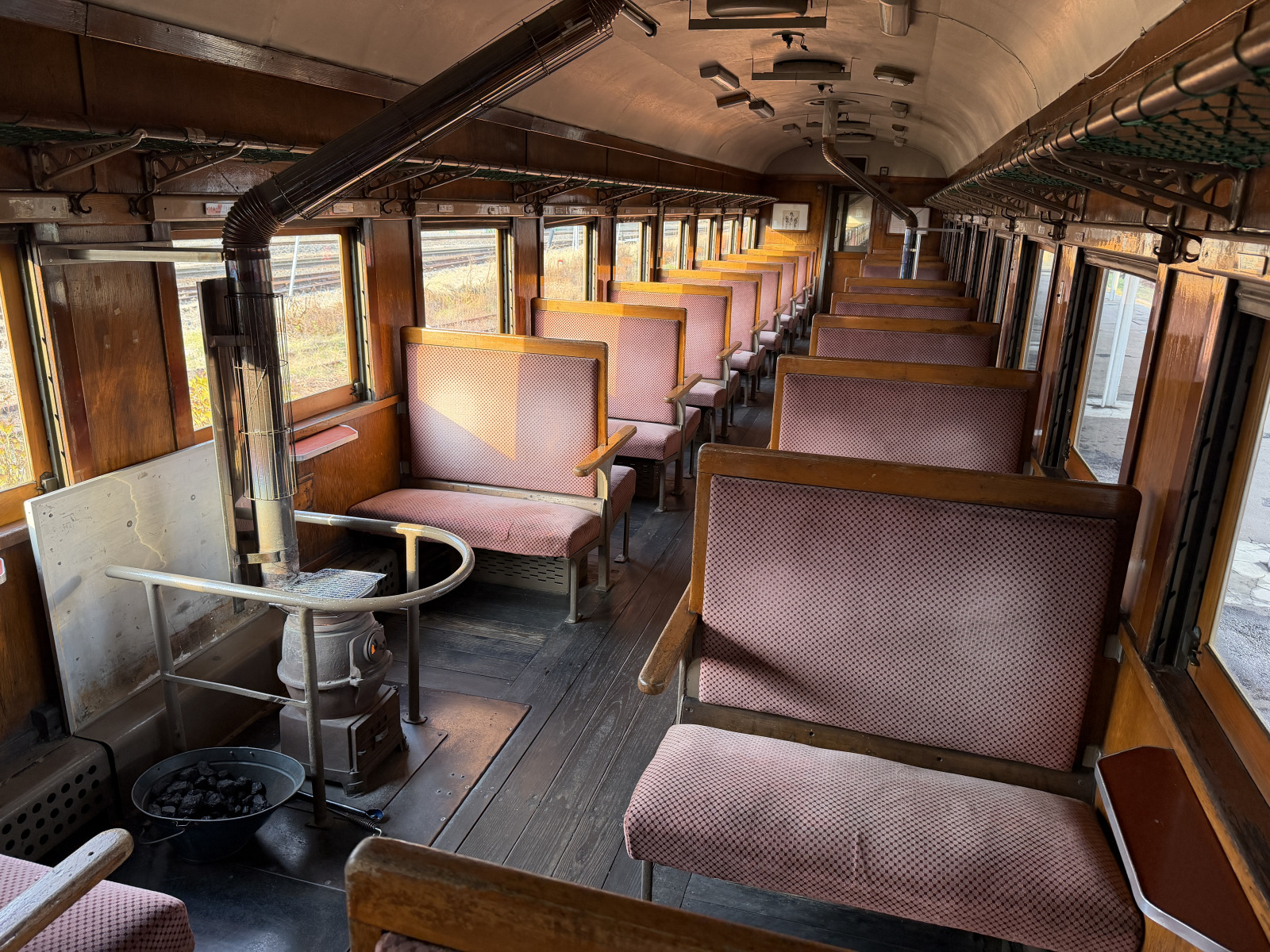 ストーブ列車車内の様子 ストーブ列車には座席指定券も整理番号もありません。並んだ順から乗り込んでいく形で、自由席となっています。そうは言っても、できればストーブの前に座りたいから、早めに並んでおきました。