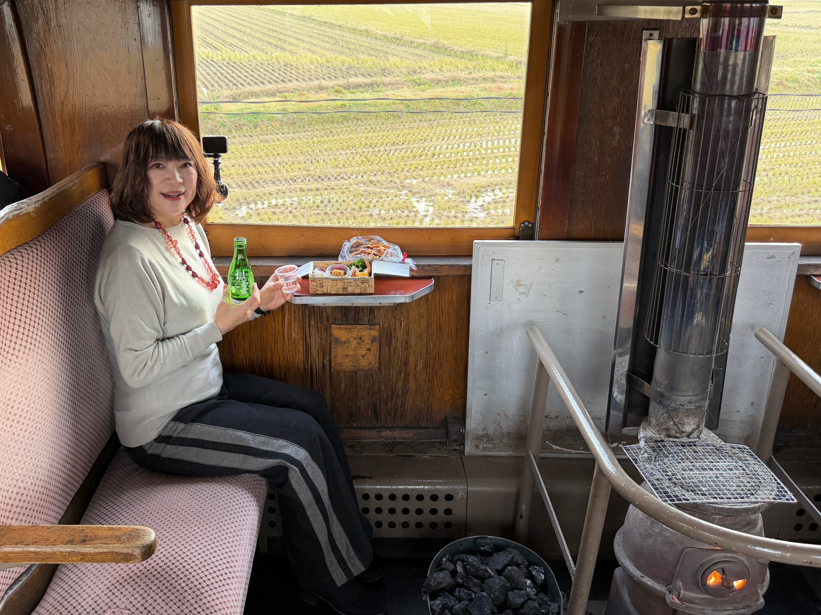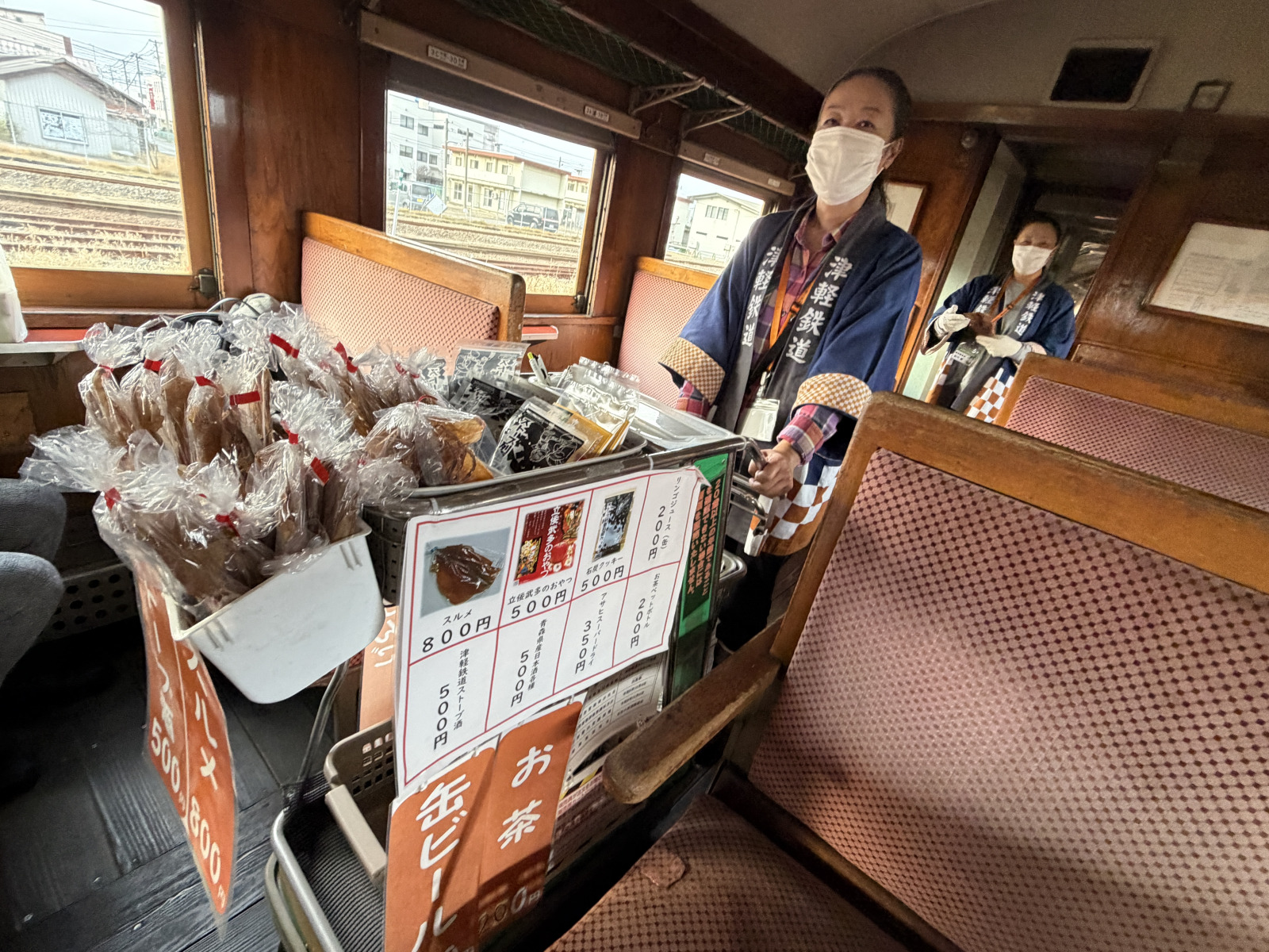 車内ではストーブが焚かれ、アテンダントさんが待機して、スルメや日本酒の車内販売も行われているそうです。また、事前予約すれば、お弁当の購入も可能です。