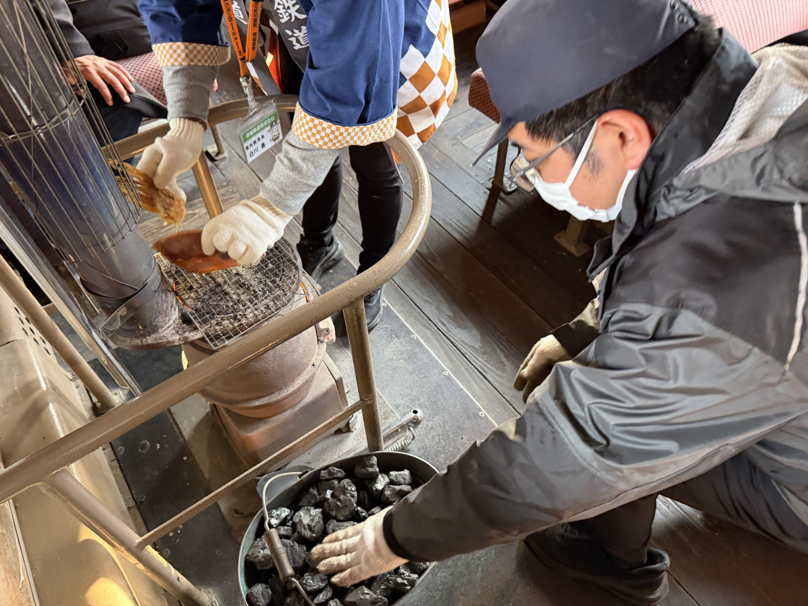 スルメを焼くアテンダントさんと、石炭をくべる車掌さん いつも買うのは、スルメと津軽鉄道ストーブ酒。買ったスルメは袋から取り出してアテンダントさんに渡します。すると、ストーブの上に押し付けてすぐに焼いてくれるのです。焼いたスルメは細かく裂いてもらえるので、そのまま食べることができます。