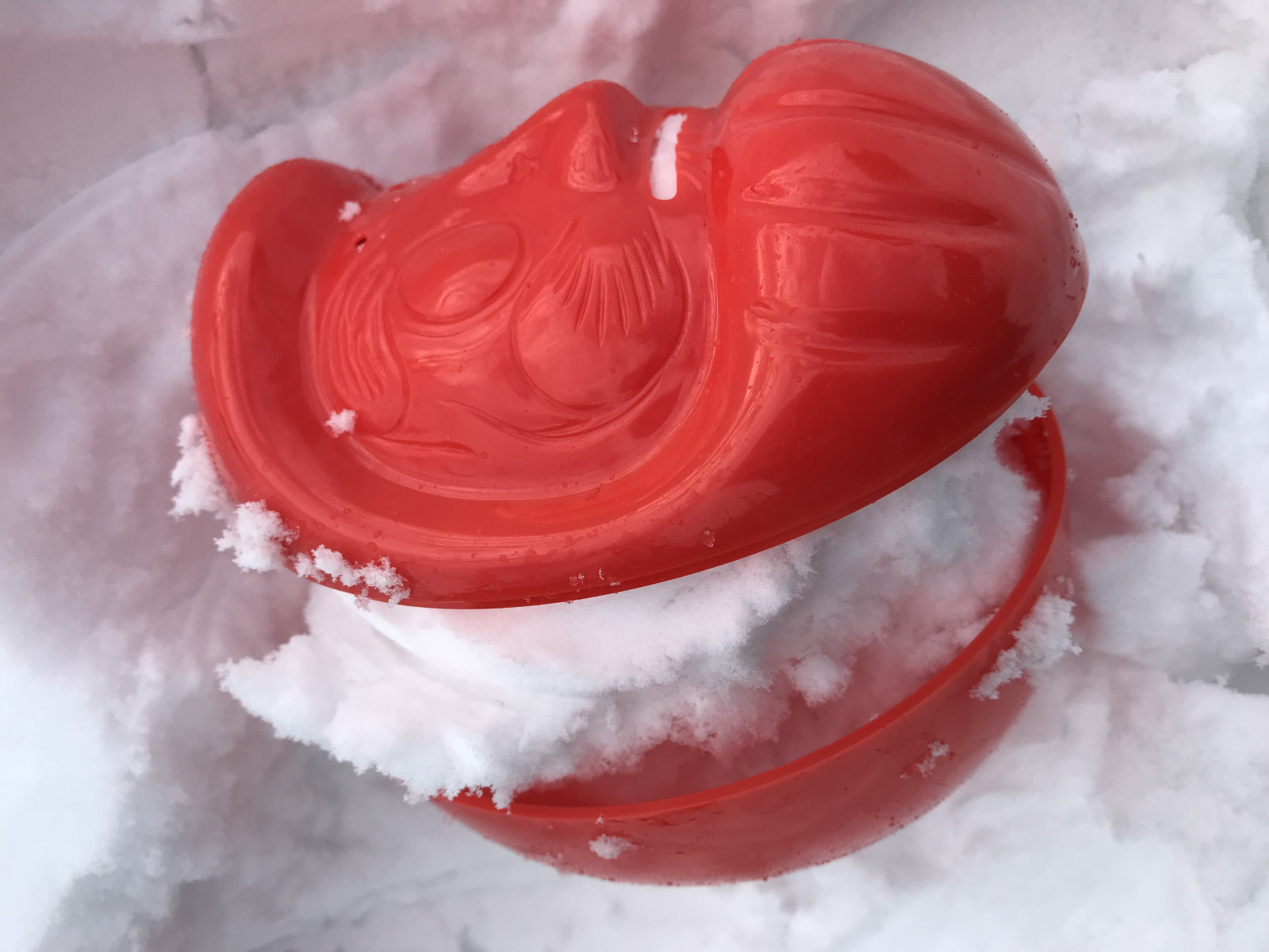 これで雪だるまを作ります。この容器は半分ずつ立体になっていて、それぞれにきっちり雪を詰め込んで合わせると、しっかりと模様の付いた立体雪だるまができるのです。