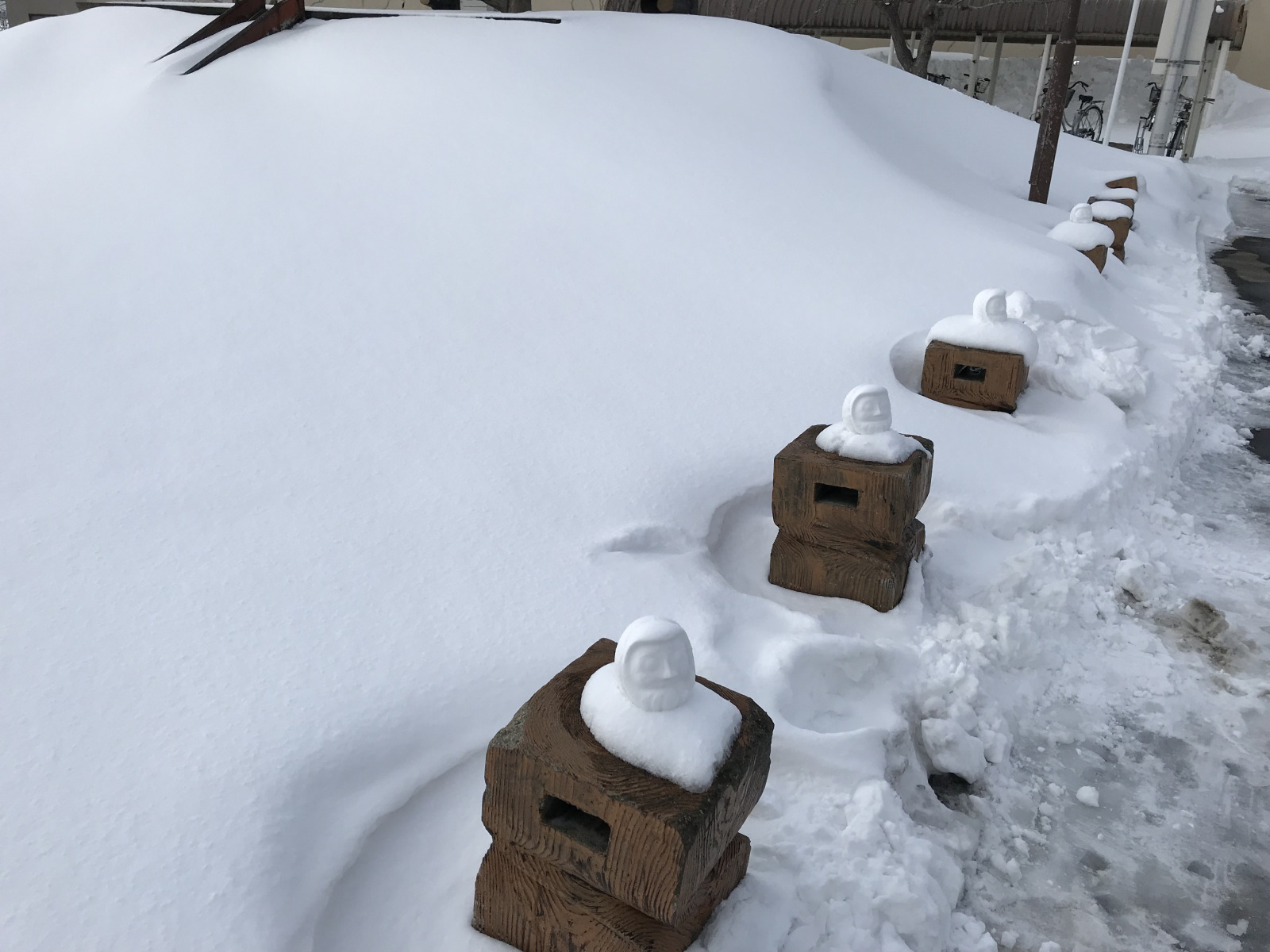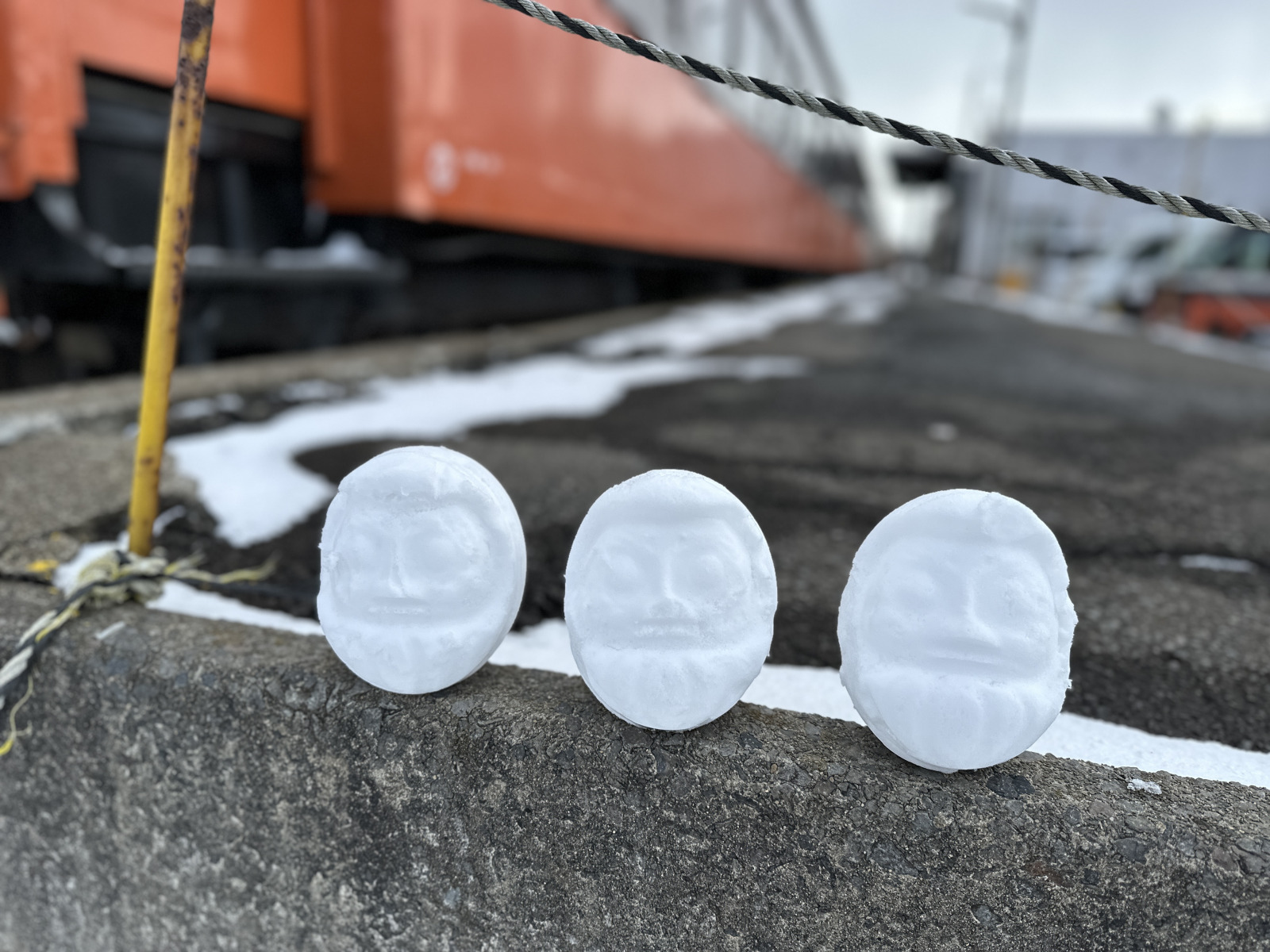 津軽中里駅で作った雪だるま 雪だるまをせっせと作って並べていたら、通りがかりの外国の団体客の方たちが笑いながら写真を撮っていきました。こうしてコミュニケーションが取れるのも楽しいです。